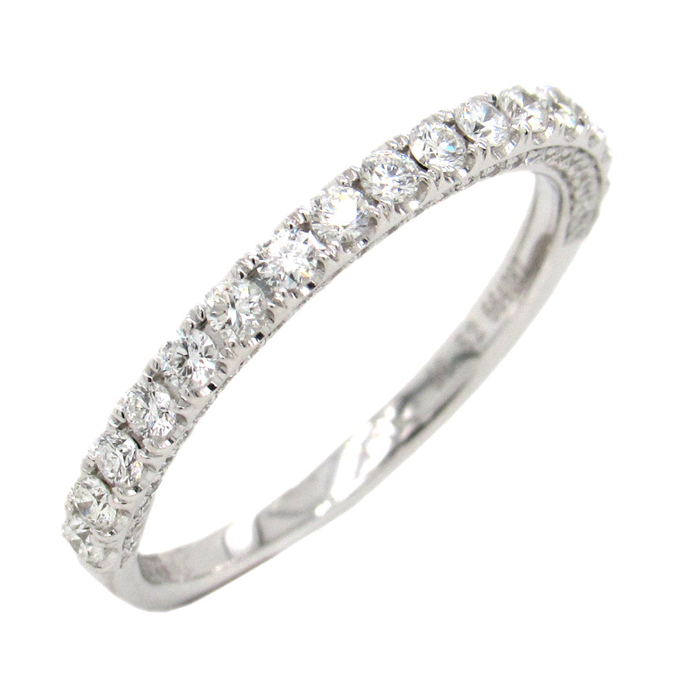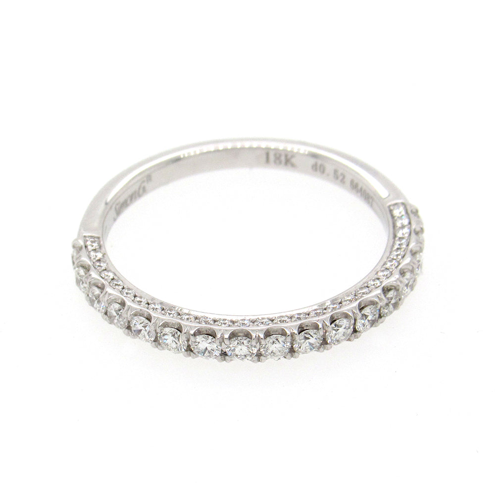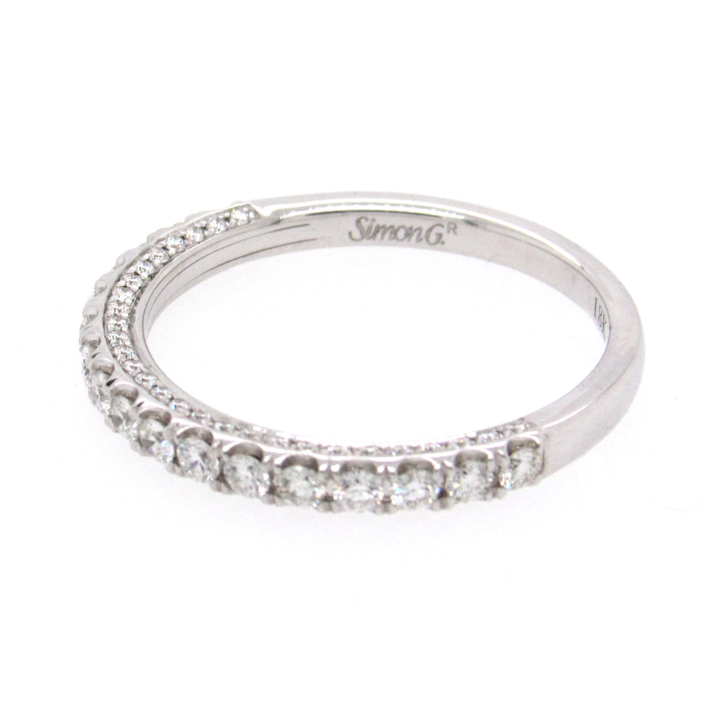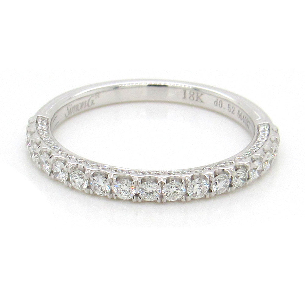 We love SimonG's diamond band prong-set at top with diamonds and on the sides, pave-set with more diamonds, 0.52 cts tw with 73 round brilliant cut gemstones. This diamond half-eternity band can be worn solo or nested with SimonG solitaires. Measures 2mm width.