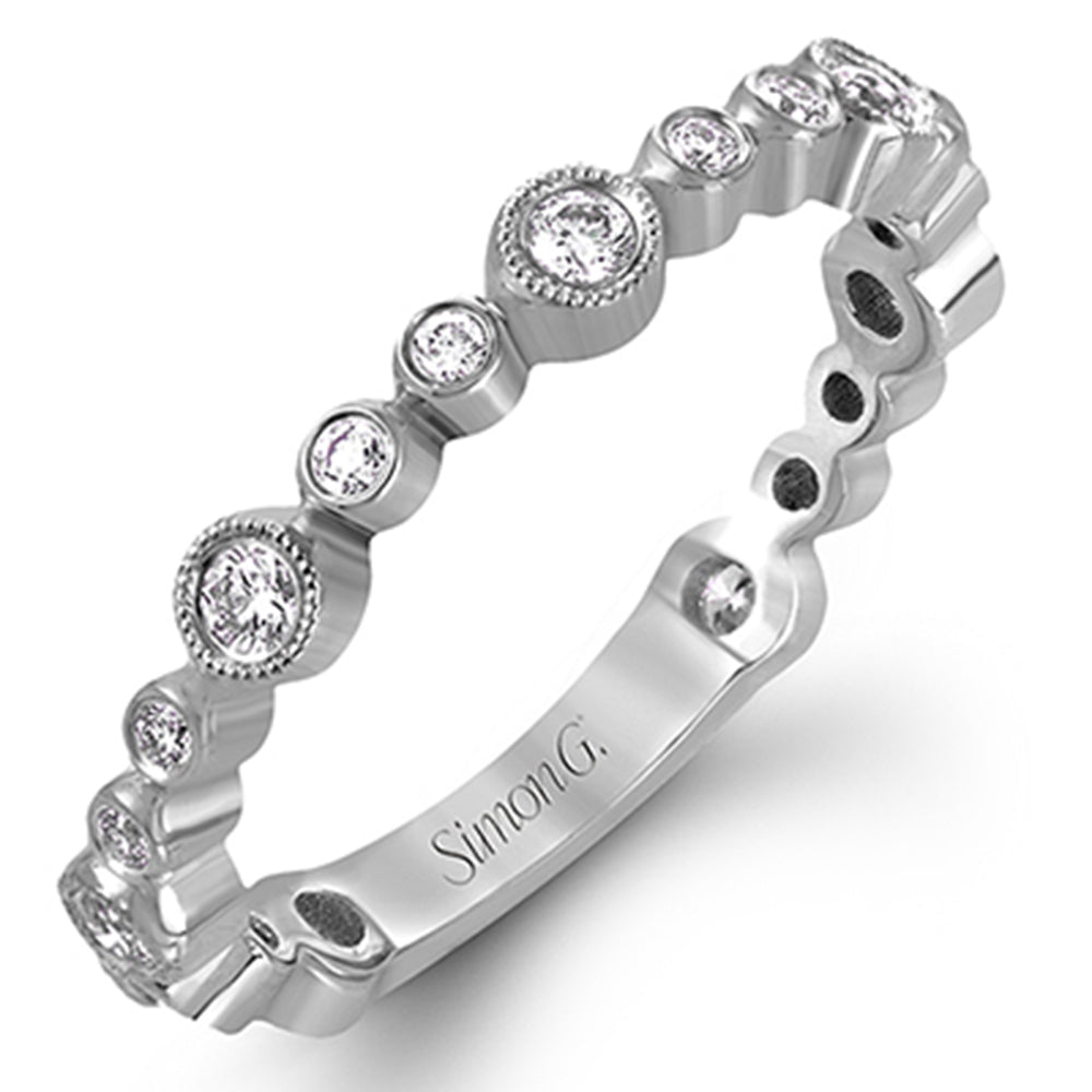 We love these stacking eternity bands in three colors from SimonG, here the 18K white gold 3/4 eternity, alternating two sizes of bezel set diamonds, 0.31 carats tw, 3mm wide.