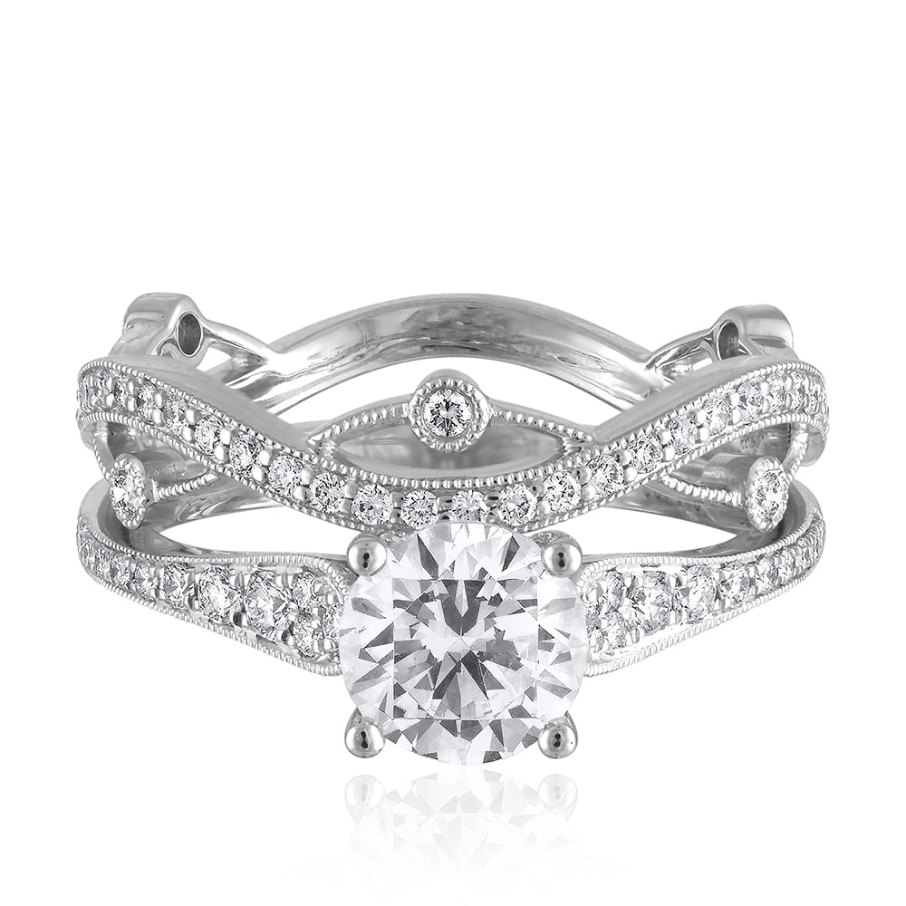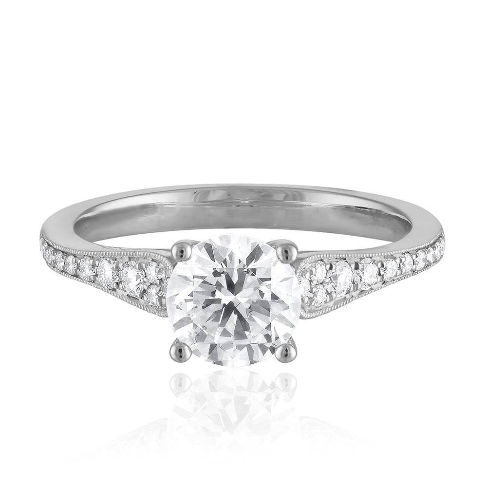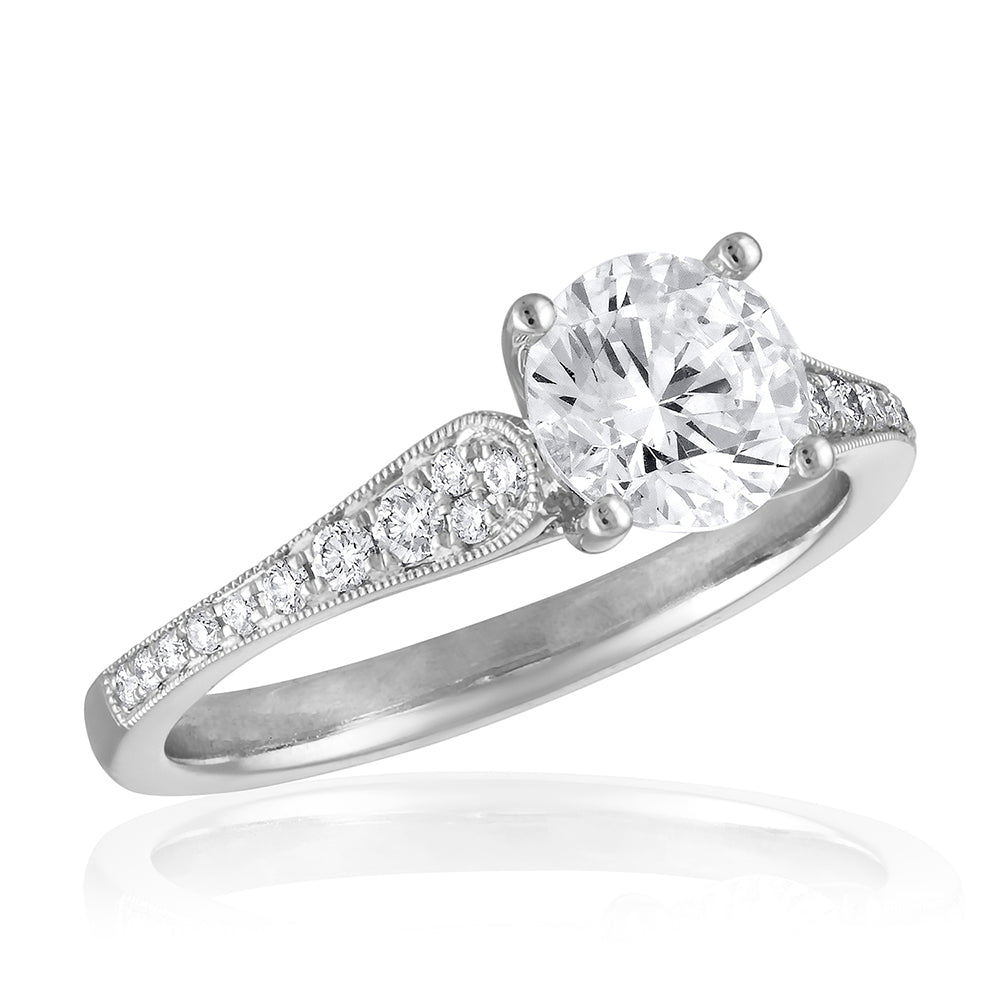 SimonG's graduated diamond pave engagement ring mounting with detailed milgrained edges, set with 22 diamonds 0.18 cts tw, for a 1.00 to 1.25 carat diamond. Shown nested with WB01425, sold separately.