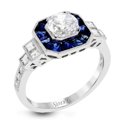SimonG creates a diamond and sapphire semi-mounting for your diamond solitaire in this meticulously crafted Deco inspired stepped mounting, set with princess-cut and round colorless diamonds, 0.40 carats, and sapphire mosaic, 0.96 carats.