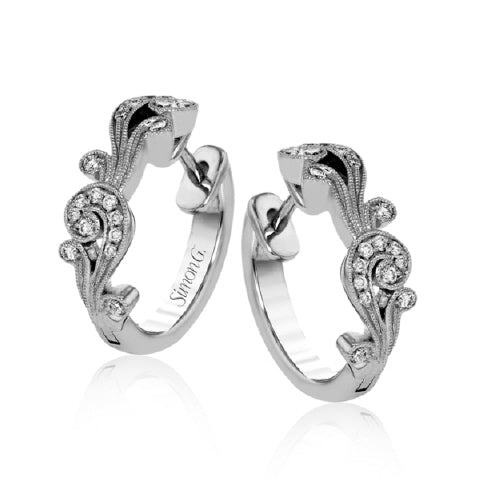 SimonG's new collection, Vintage Explorer, looks at the intricacy and details of true heirloom designs, classics that can be worn and shared. 18K white gold scalloped hoop earrings are set with 0.23 carats micropavé diamonds, engraved in fine detail. Available as well in platinum or yellow gold. earrings measure 1/2" in diameter.