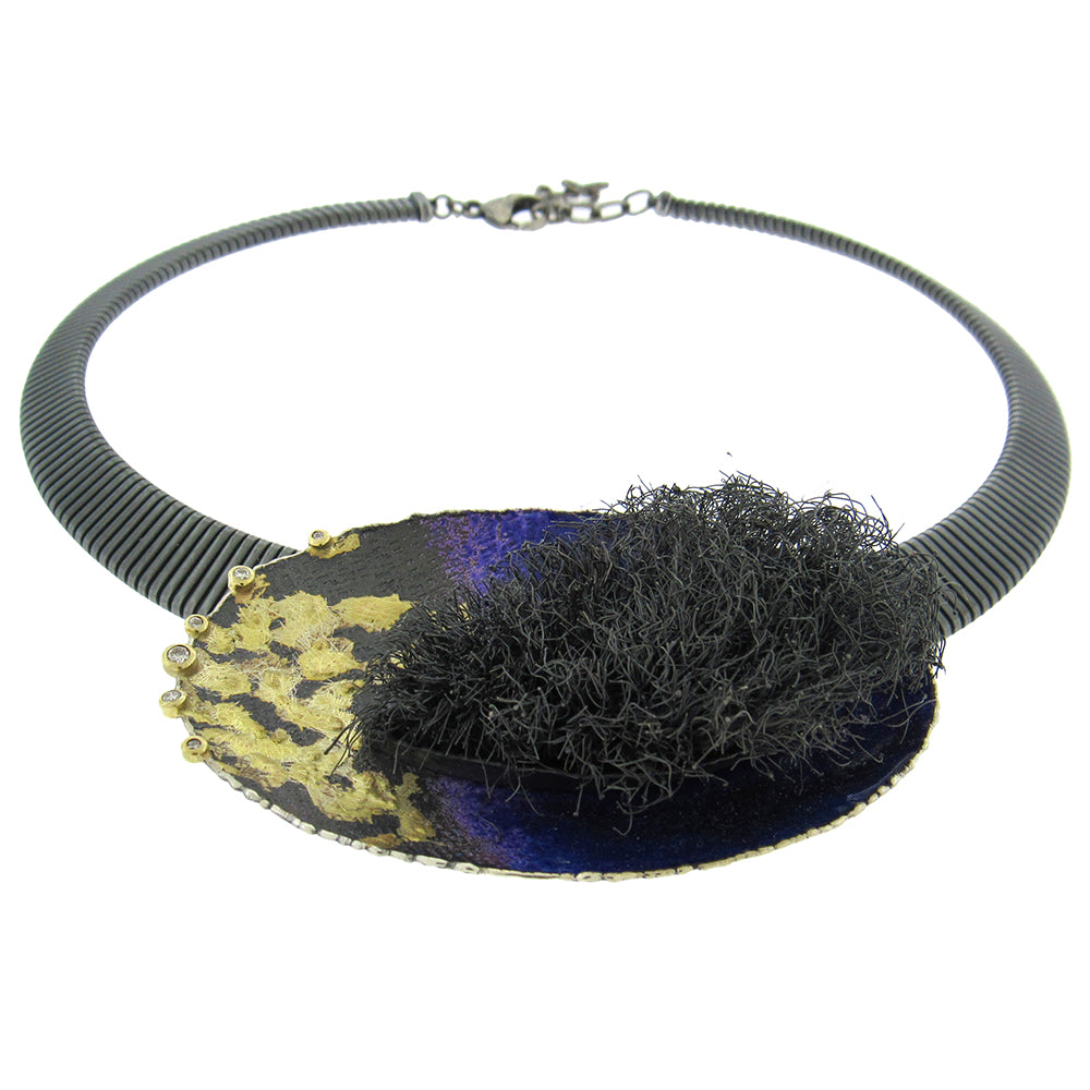 So Young Park's necklace manifests her work as an artist and a jeweler, with its oval concave form, patinated and powder-coated violet enamel, with a rough textured oxidized sterling wire cloud floating at one edge, diamonds at the other. The oval brooch/pendant measures 3-1/4" x 2" x 5/8", on a graduated oxided stelring tubogas necklace with adjustable clasp, 16"-18".