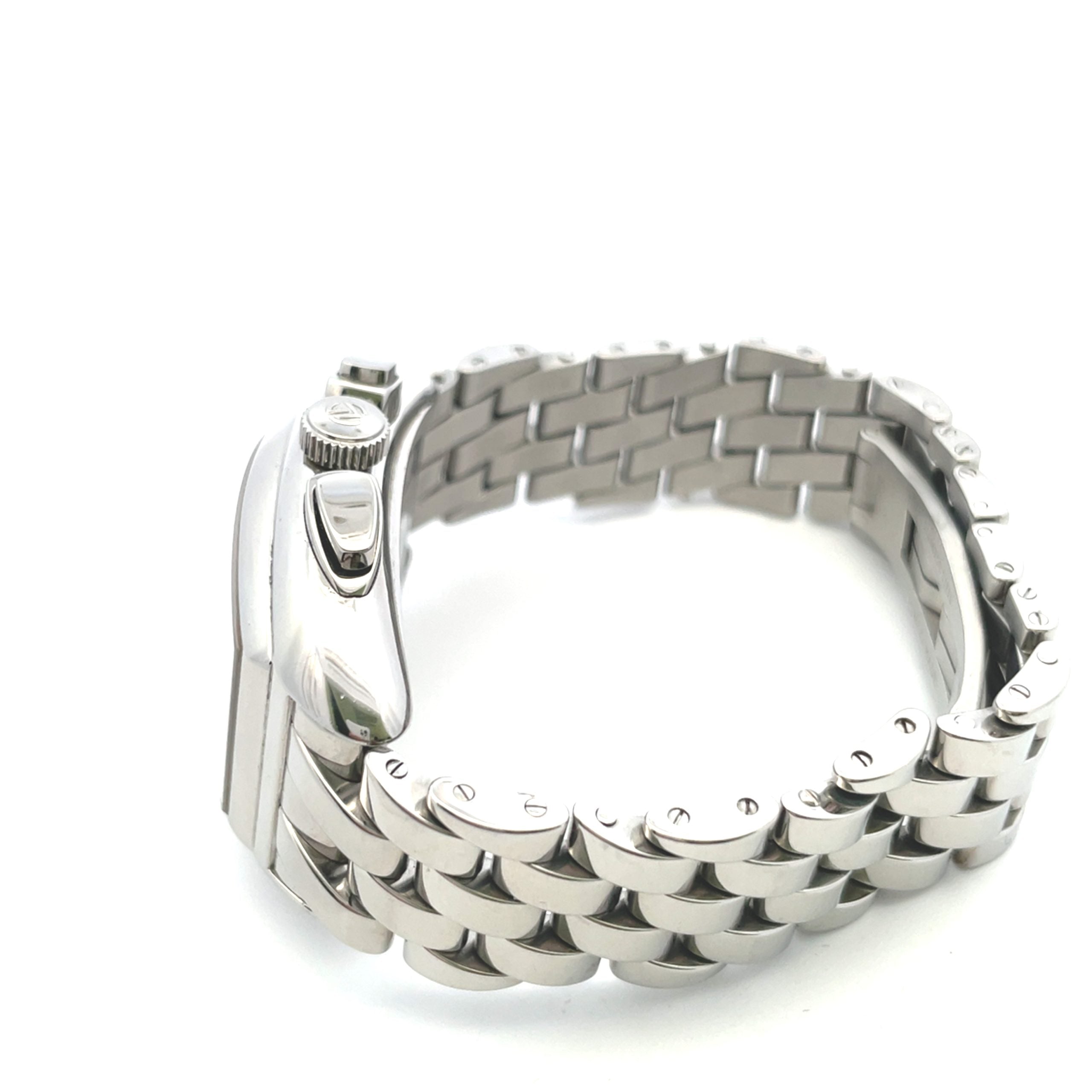Stainless steel Franck Muller, Genève, Conquistador, Ref. 8005 CC, number1905, made circa 2000’s, is a 34mm x 49mm tonneau-shaped and curved, self-winding, water-resistant oval-button chronograph, with register, date and a stainless steel Franck Muller bracelet with fliplock clasp. The guilloche dial features white luminous exploding Arabic numerals, subsidiary dials for the 30-minute and 12-hour registers, red outer minute/second chapters and red 'Conquistador', aperture for the date at 6, and luminous leaf hands. The caliber 1185 37 jewel automatic movement is warrantied by Aaron Faber for 1 year. With box and paper.