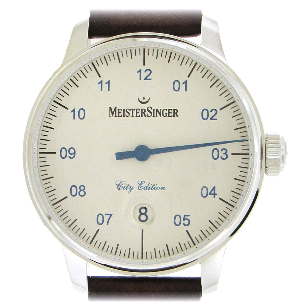 Meistersinger's single hand NYC City Limited Edition Skyline, 43mm in stainless steel, is a self-winding classically designed wristwatch with see-through back silhouetted with New York's skyline, ash dial with painted Arabic numerals, date window at 6, blued steel hour hand, Swiss made 26 jewel automatic movement warrantied by the manufacturer for 2 years, accompanied by box and papers. This 'The City That Never Sleeps' series is a limited edition of 10 pieces, this is number 8.
