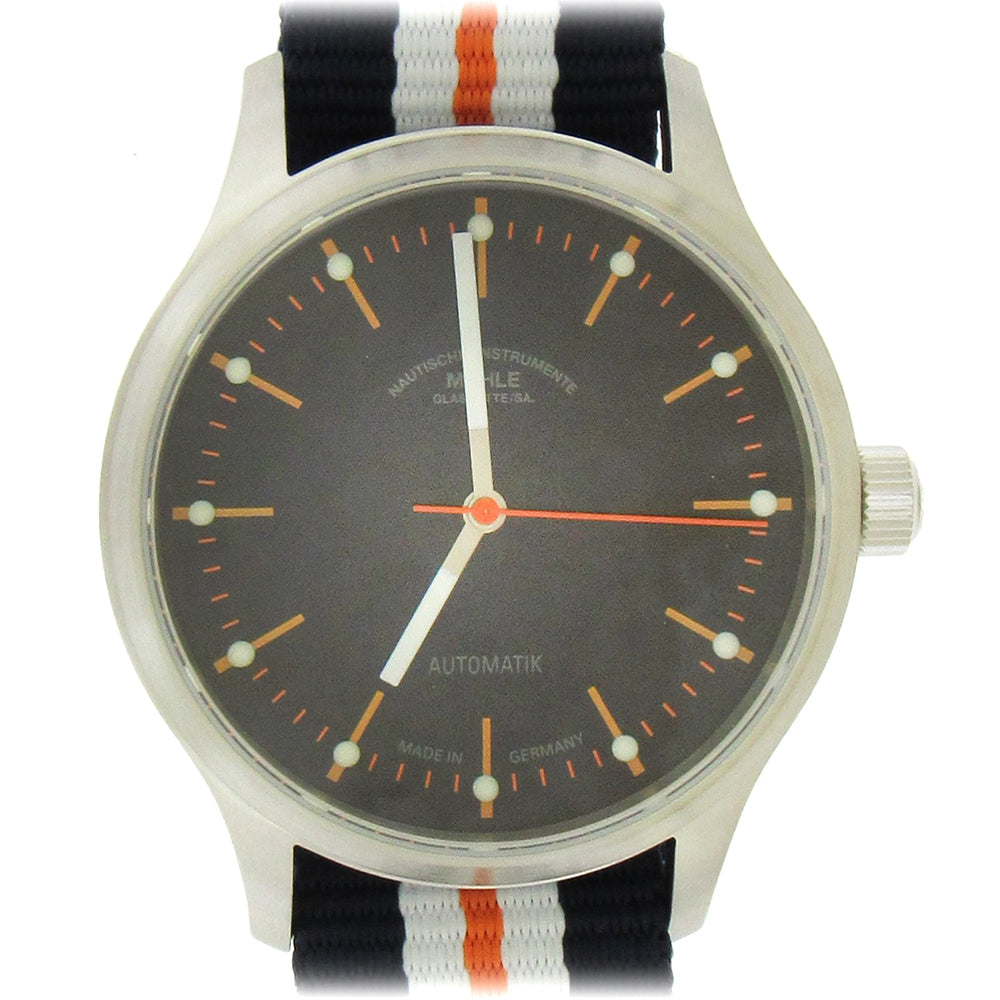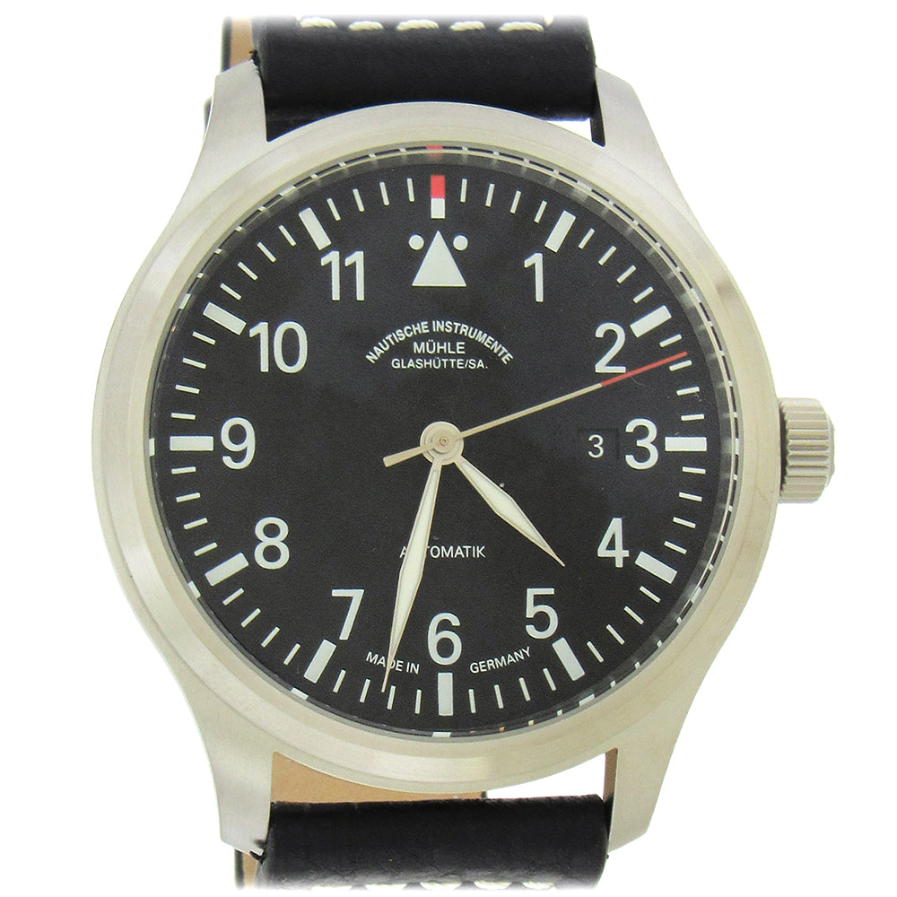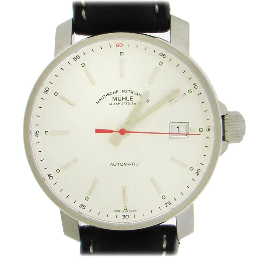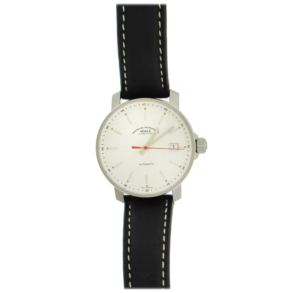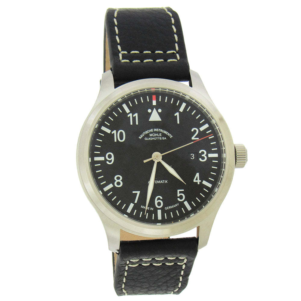Muhle Glashutte Terra Sport 1 is a large format automatic sports wristwatch from this German designer. The 44mm case has a see-through screwed-down back, black dial with luminous white Arabic hours, date window at 3, center second sweep hand, sapphire crystal, water-resistant to 100 meters, and self-winding Swiss movement warrantied two years by the manufacturer.