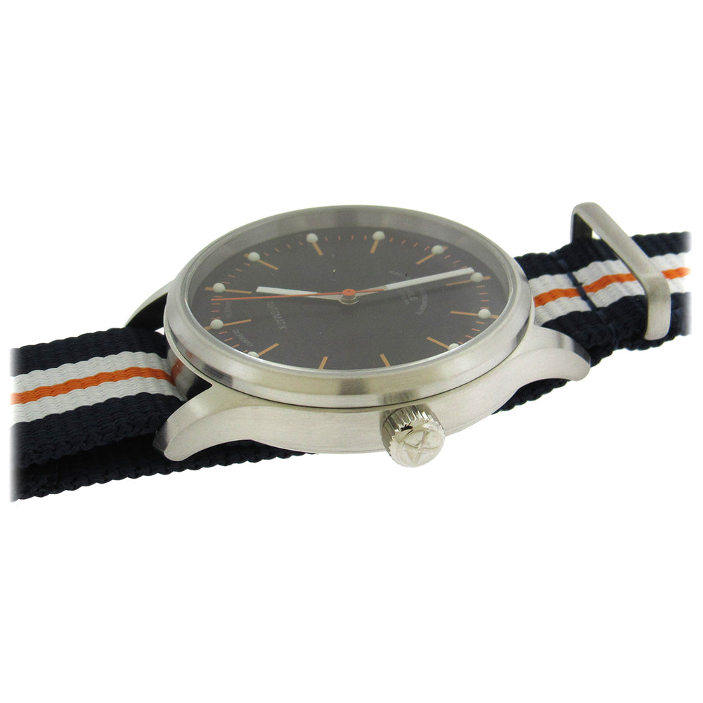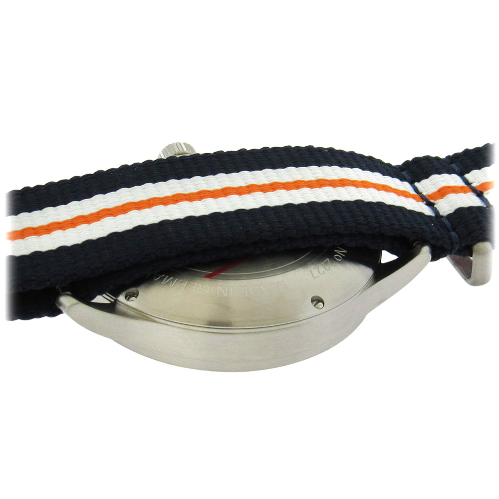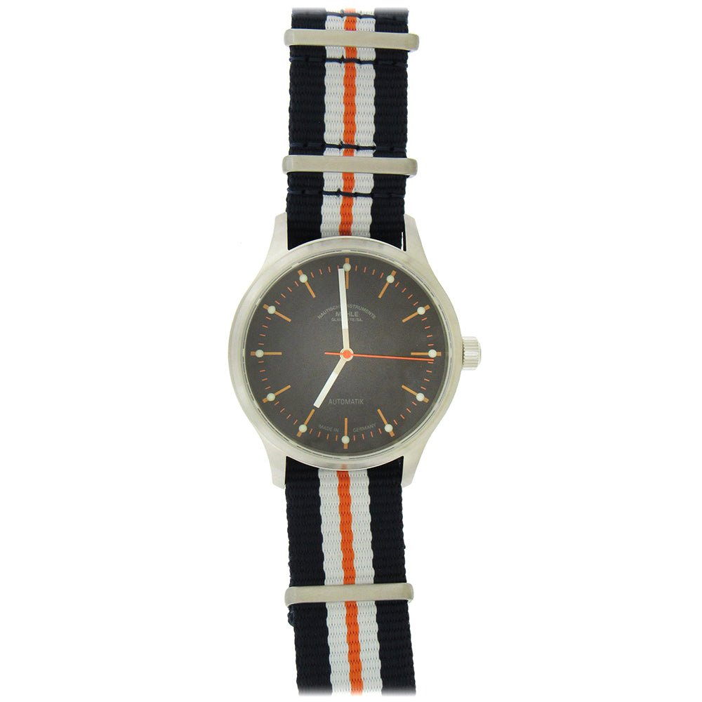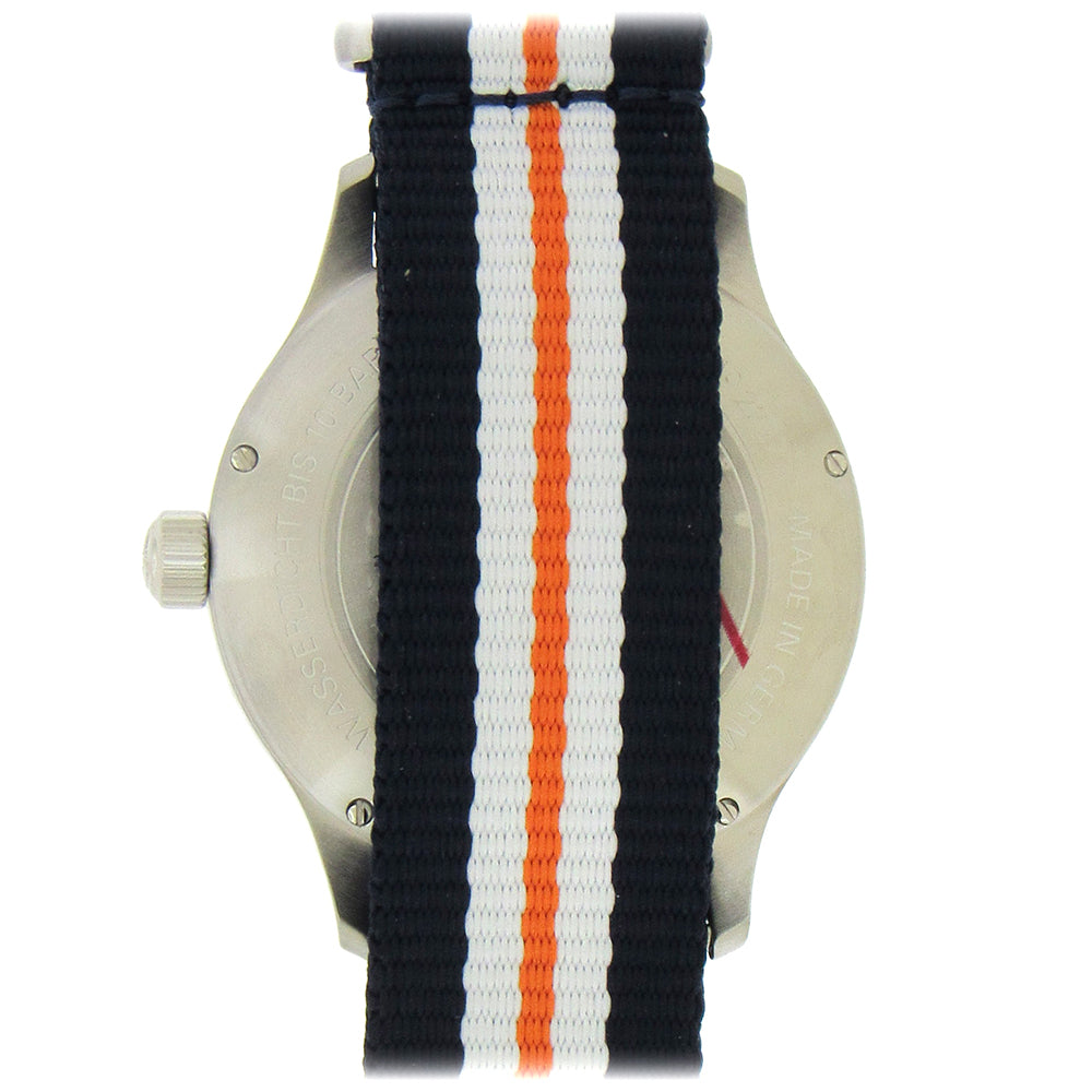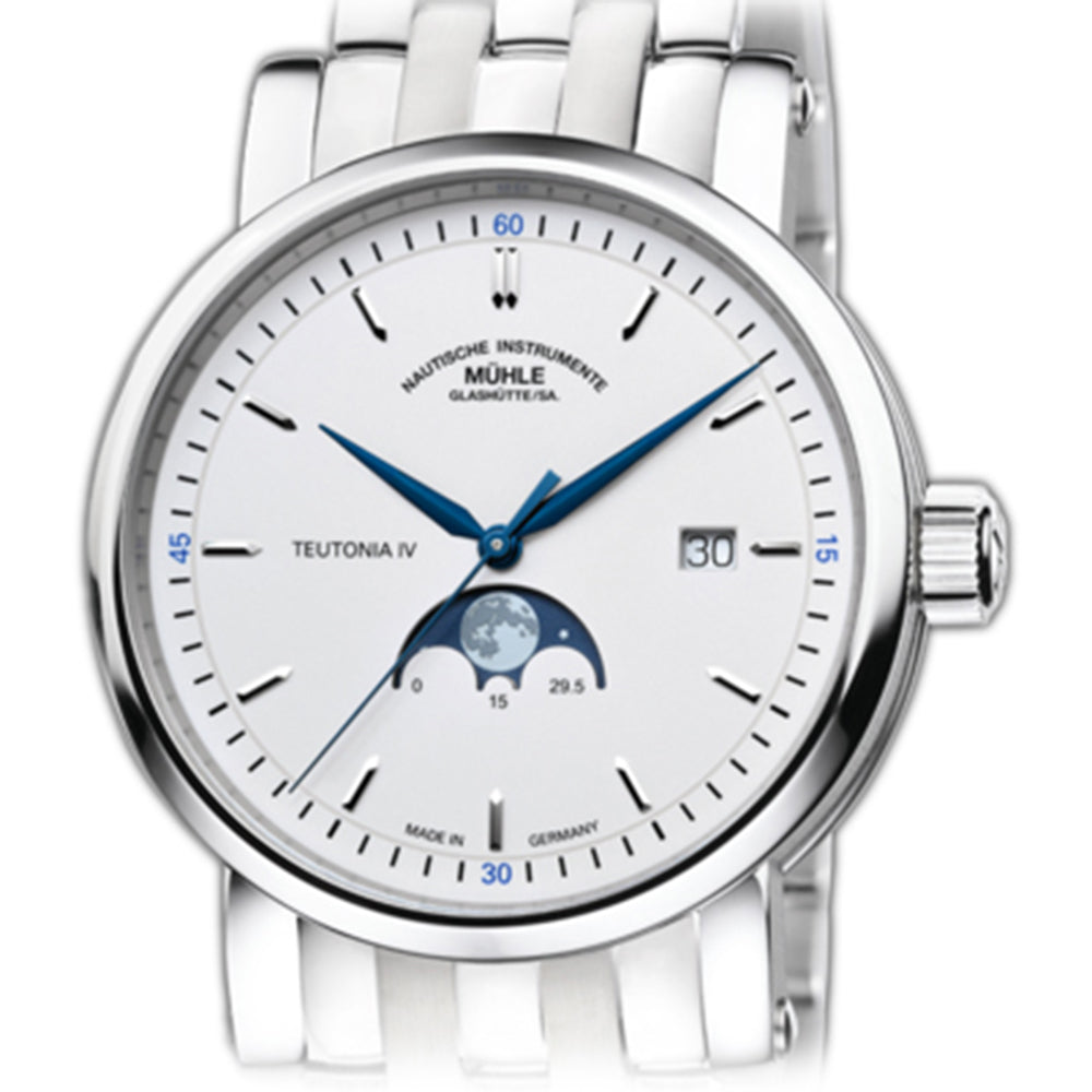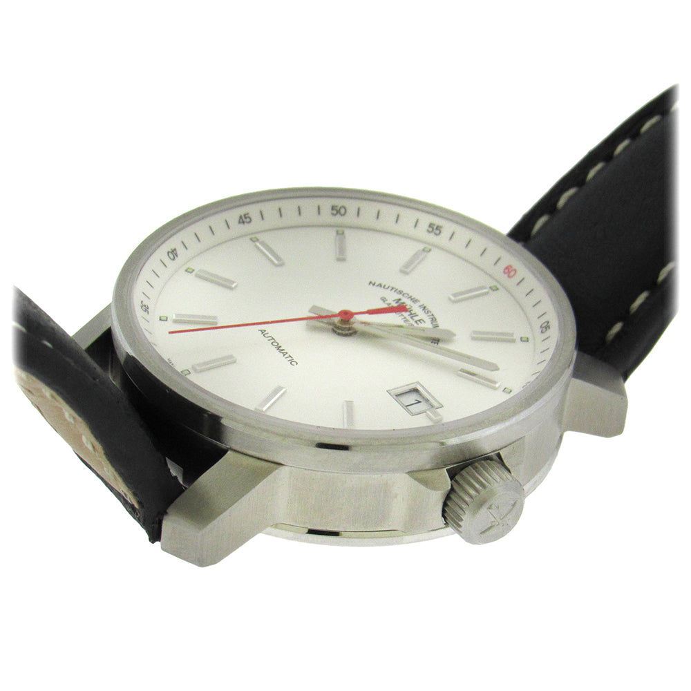 Muhle Glashutte Terra Sport 1 is a large format automatic sports wristwatch from this German designer. The 44mm case has a see-through screwed-down back, black dial with luminous white Arabic hours, date window at 3, center second sweep hand, sapphire crystal, water-resistant to 100 meters, and self-winding Swiss movement warrantied two years by the manufacturer.