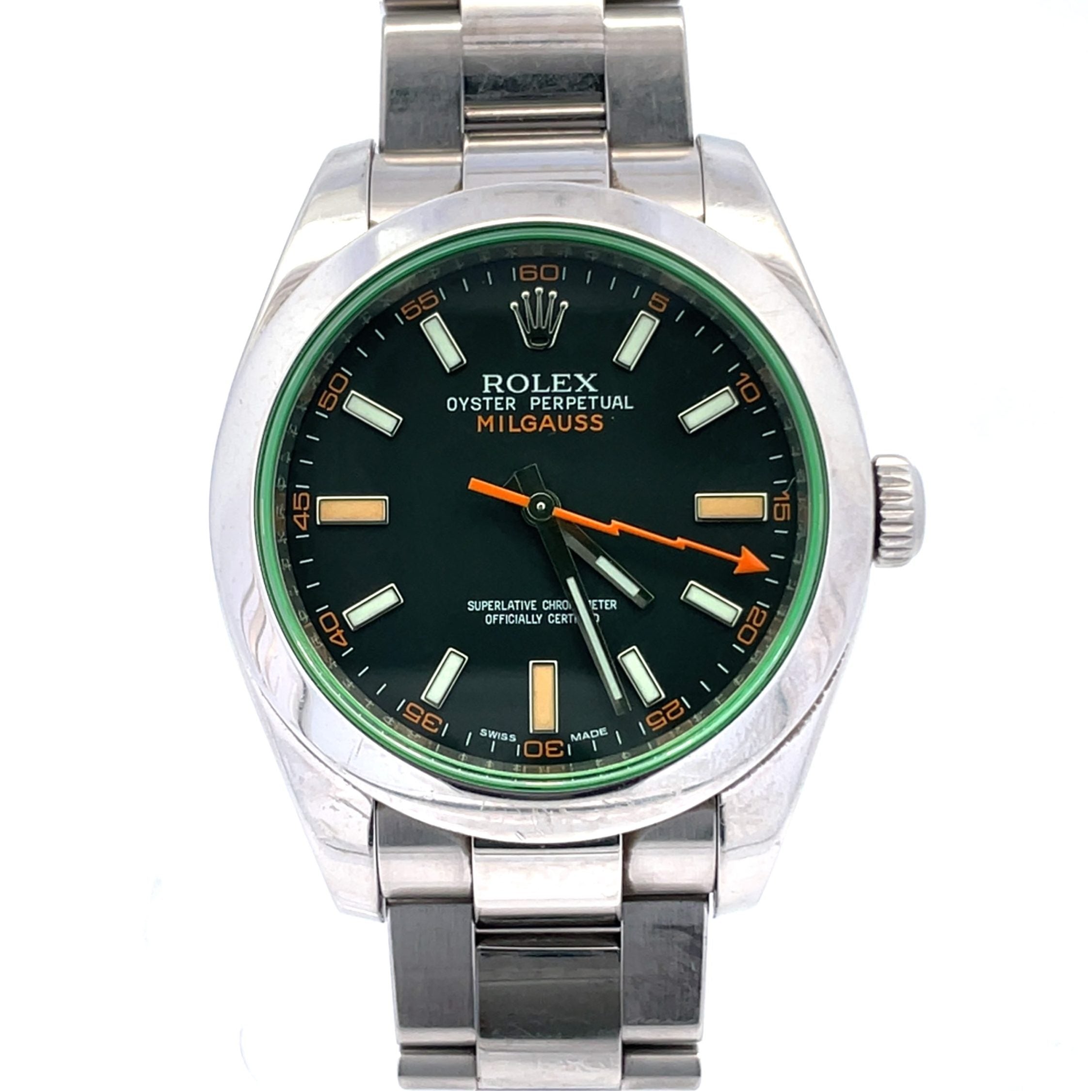 Stainless steel Rolex Ref. 116400V is the black dial Milgauss Oyster Perpetual, made in 2010, a 40mm automatic wristwatch with its signature anti-magnetic shield to 1000 Gauss with a green sapphire crystal and a stainless steel Rolex Oyster bracelet. Accompanied by original box and card. The automatic caliber 3131 movement, 31 jewels, is warrantied by Aaron Faber for 2 years.