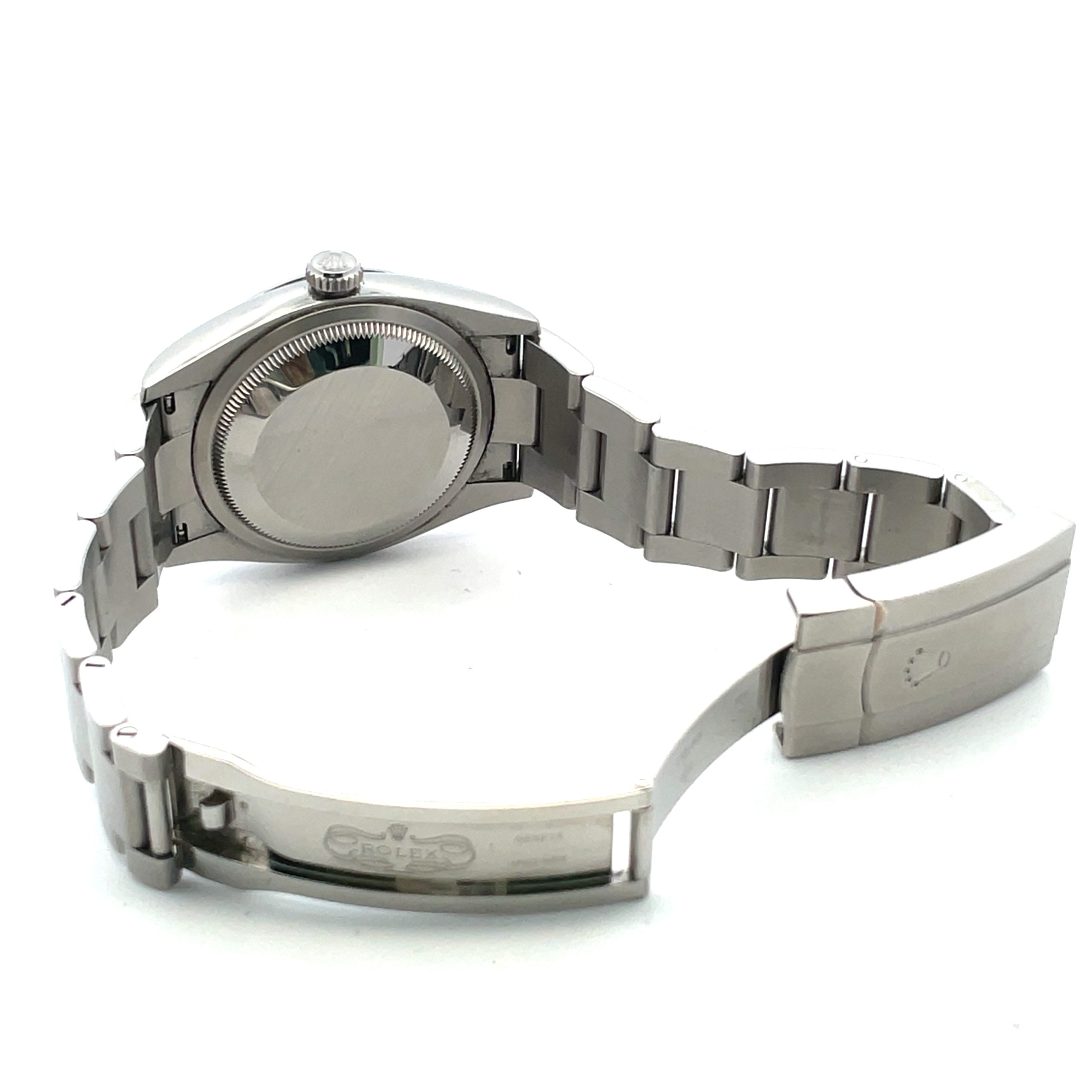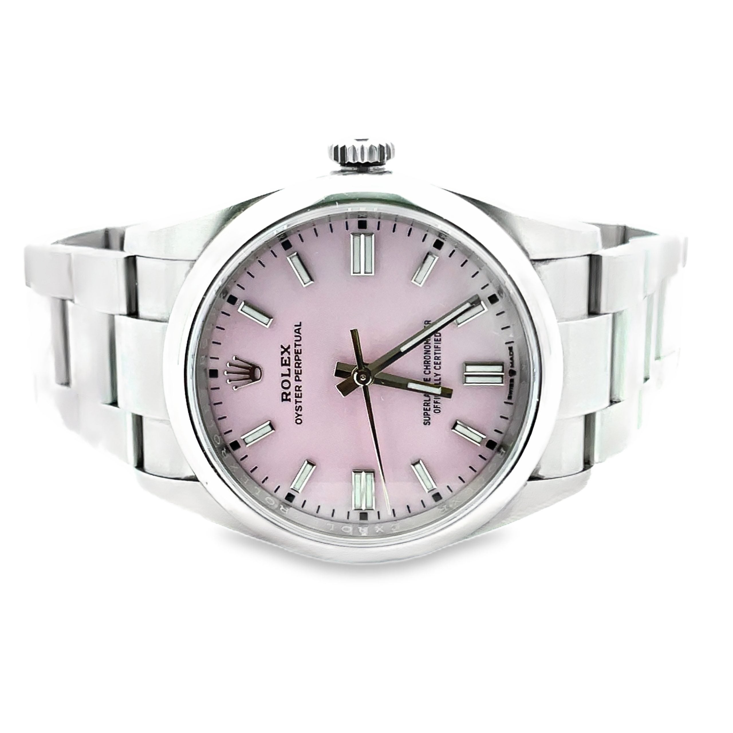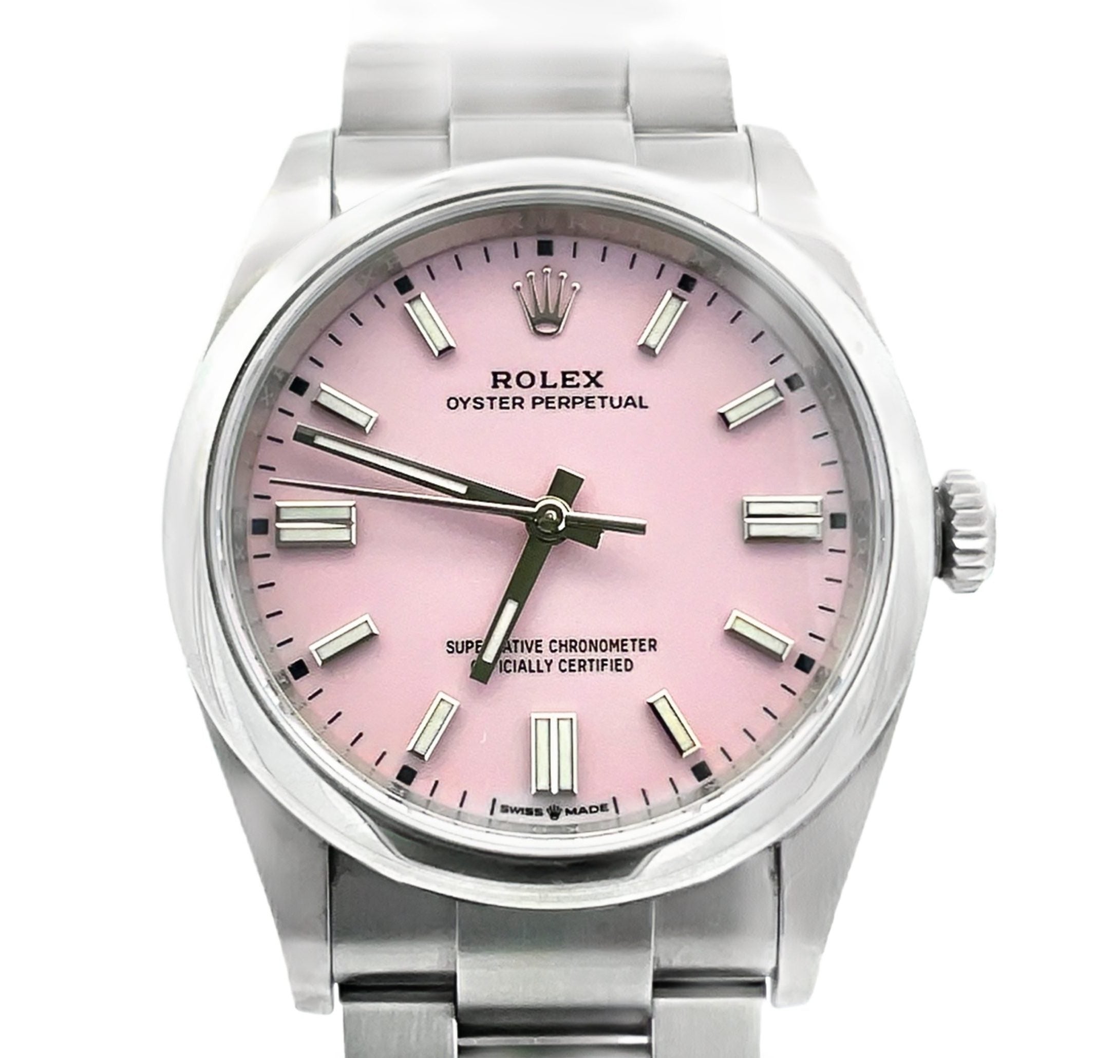Stainless steel Rolex Oyster Perpetual, Ref. 126000, 36mm, with candy pink dial, dated 2023, luminous white applied baton hour markers, Rolex caliber 3230 automatic movement with 70 hour power reserve, Rolex Oyster bracelet, and original box, card and link. Previously owned, excellent condition.