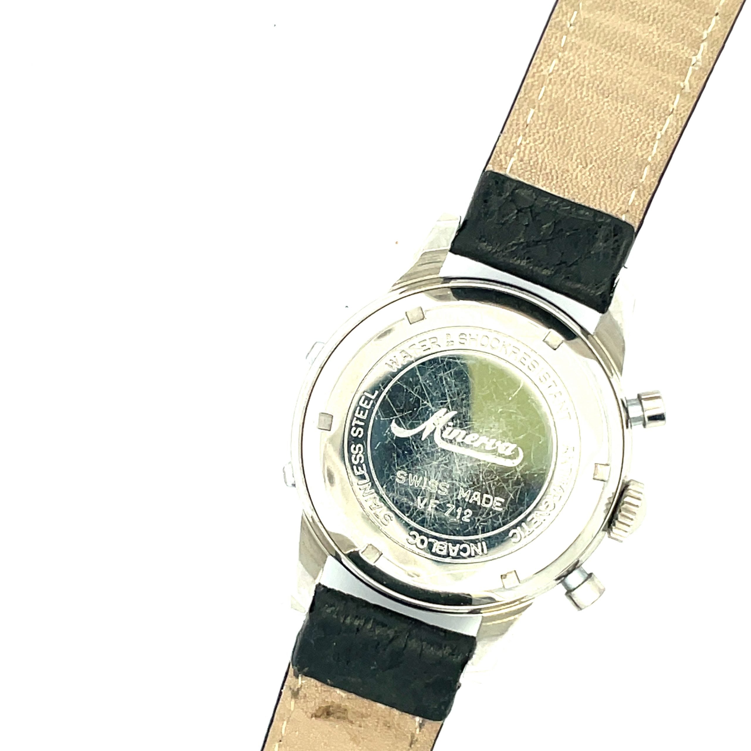 Stainless steel triple date calendar wristwatch by Swiss chronograph maker Minerva, Ref. VF712, circa 1960, is a 36mm very good condition triple date calendar chronograph with screw-down back. The pearlized white dial features constant seconds, 30 minutes and 12 hour registers with outer date reserve with red arrow-tipped hand and day and month windows at 12. The caliber 723 manual wind movement is warrantied by Aaron Faber for 2 years.