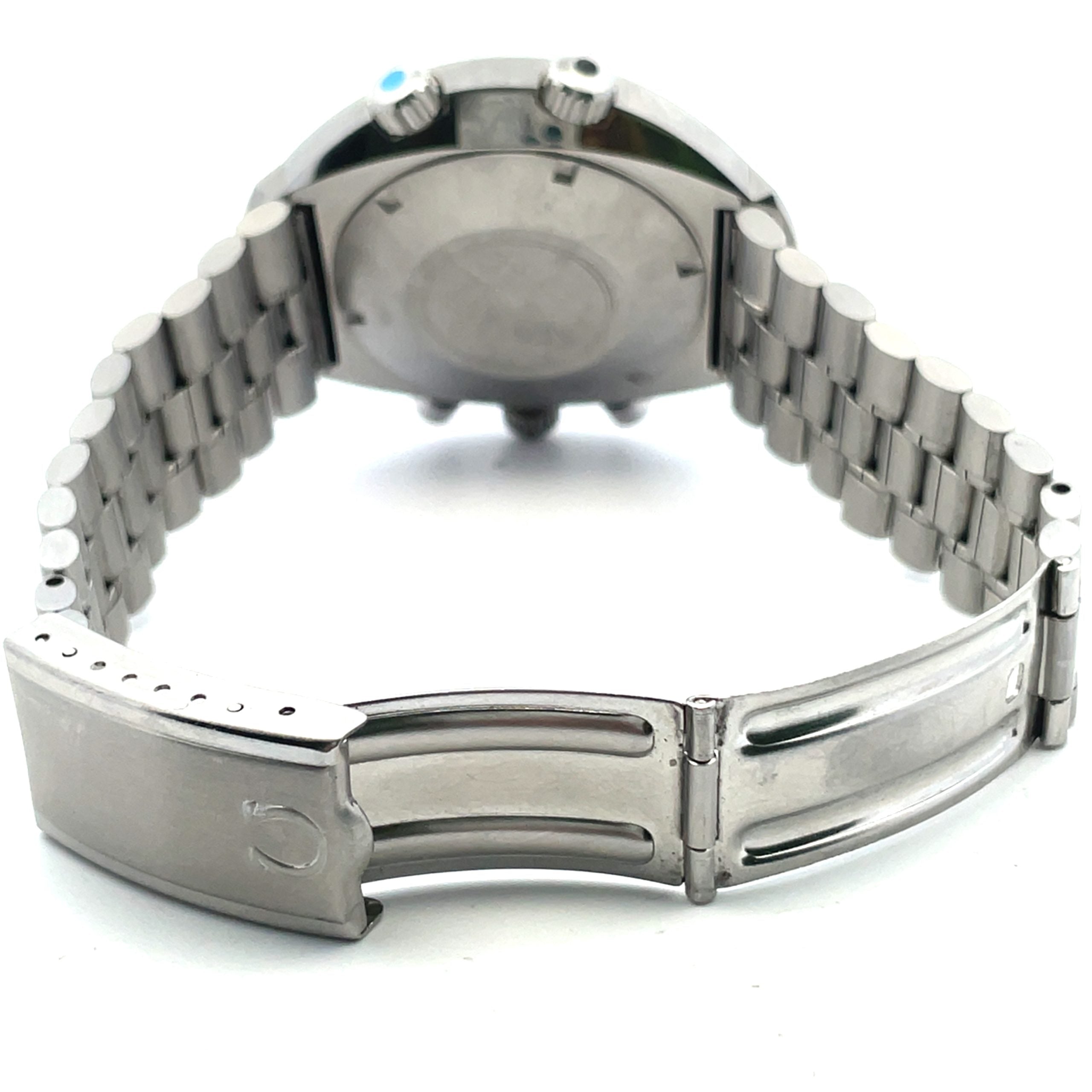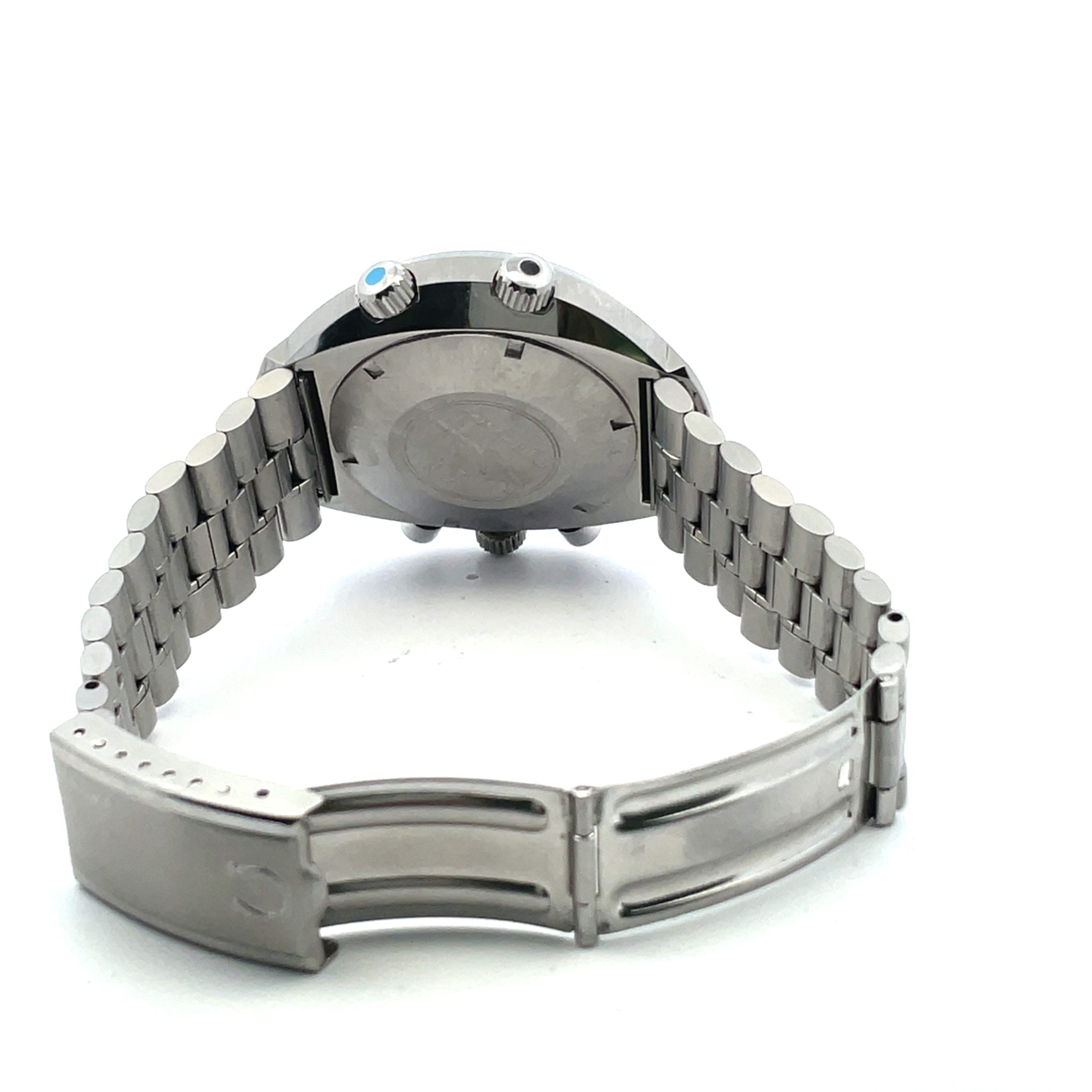 Stainless steel Omega Flightmaster, circa 1970's an oversize tonneau-shaped, two time zone, water-resistant, stainless steel aviator's wristwatch with 4 hands and 3 crowns, round button chronograph, 12-hour and 30-minute registers, with Omega steel bracelet with deployant clasp. The brushed case measures 43mm x 52mm, hooded lugs, with crown at 3 for time setting, between 8 and 9 for revolving minute ring, and between 10 and 11 for second time zone. The tricolor dial is anthracite, black and silver with luminous indexes, outer white checkerboard 1/5th second scale, outermost revolving 60 minute ring for elapsed times, black subsidiary dials for the seconds, the 12-hour and 30-minute registers, luminous white baton hands for the time functions, orange hands for the chronograph, luminous blue hand for the second time zone. Caliber 911 movement, 17 jewels, manual wind, with dial, case and movement signed. Warrantied by Aaron Faber for 2 years.