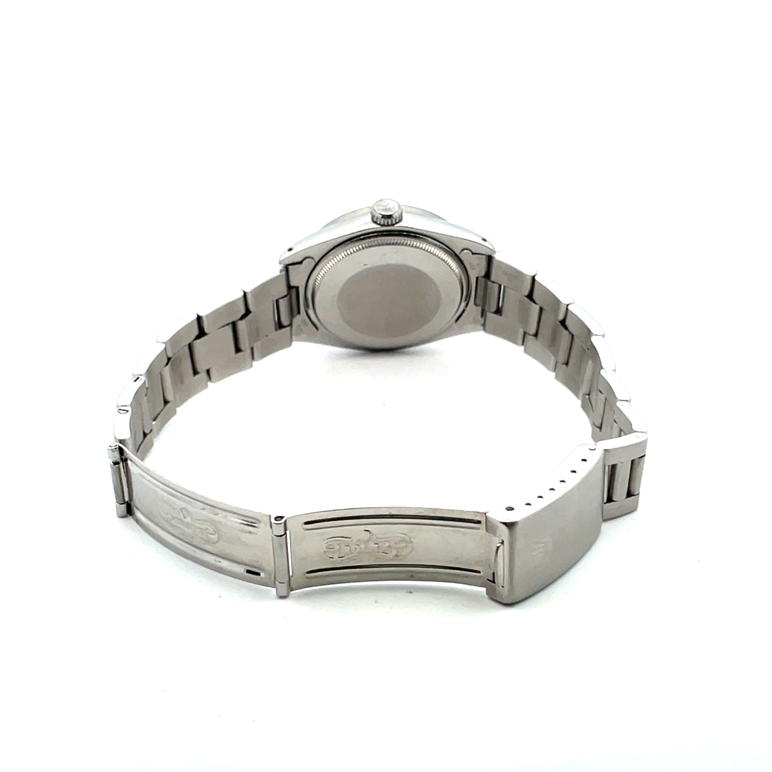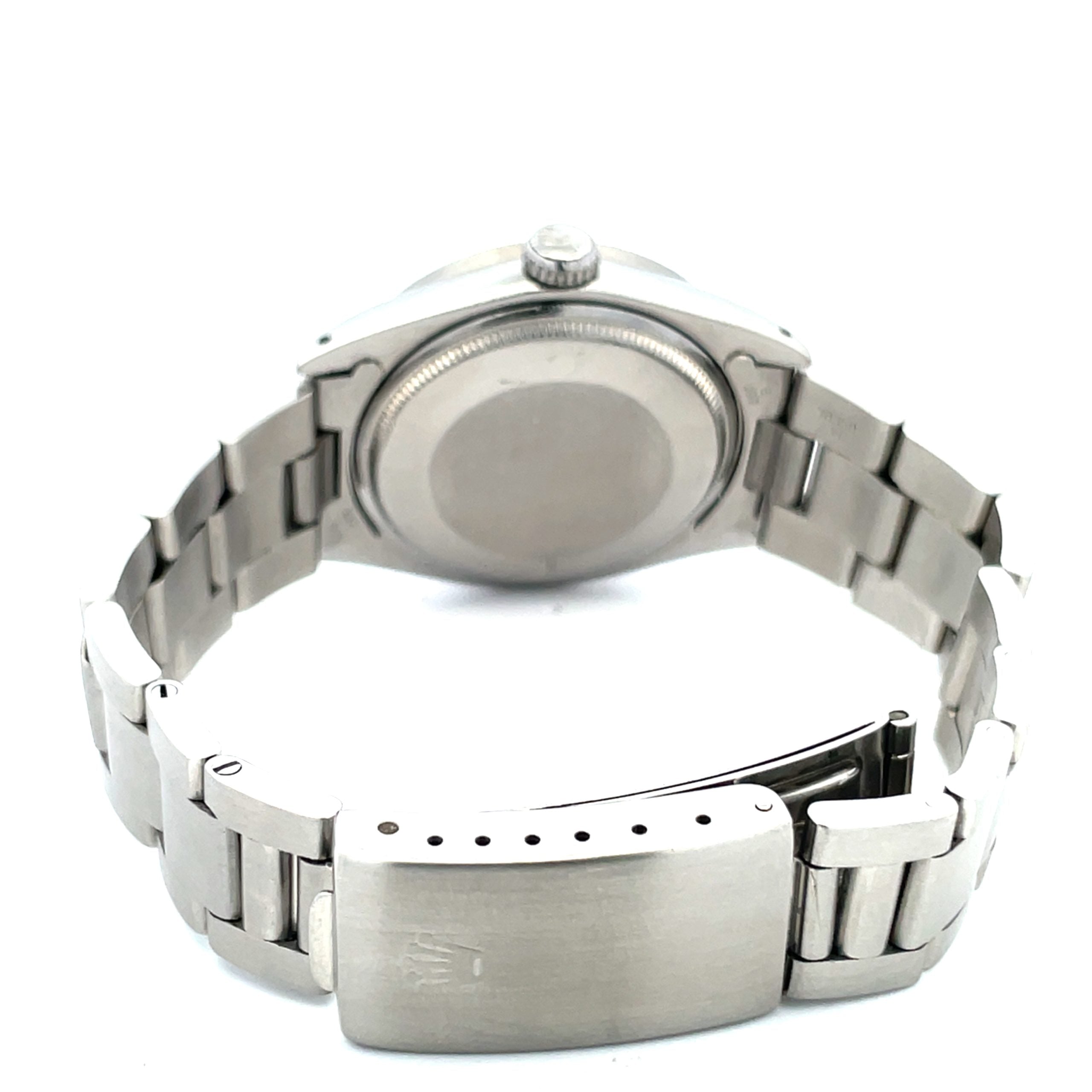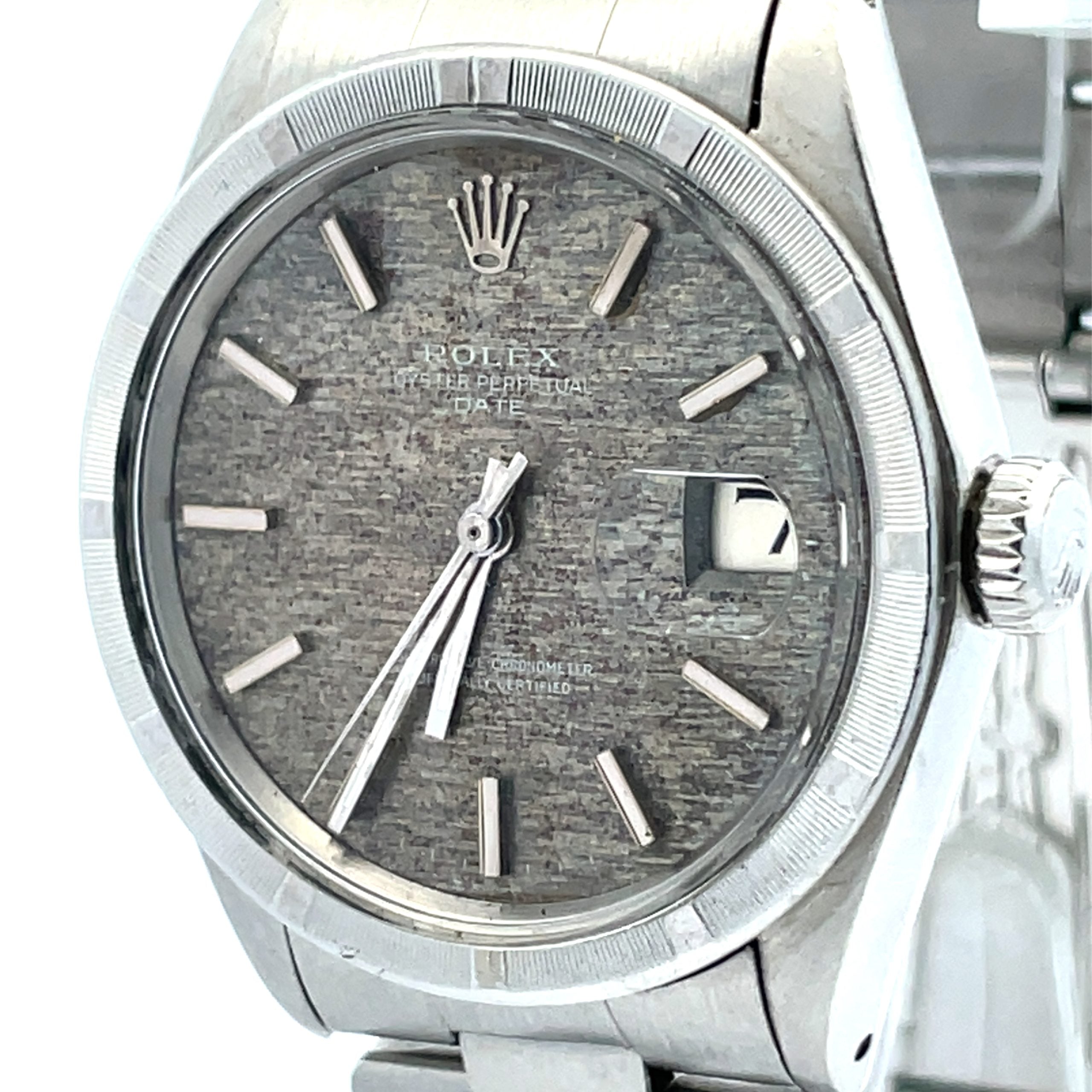 Stainless steel Rolex OP Date, Ref. 1601, circa 1970, is a vintage wristwatch with a highly desirable slate gray patinated textured dial, thunderbird bezel, date window at 3, and a stainless steel vintage Oyster bracelet with foldover clasp. The 36mm case has a screwed-down case back and crown, crystal with cyclops lens, patinated gray dial with applied baton indexes, outer minute/seconds divisions, aperture for the date and steel luminous baton hands. The movement is caliber 1570, 26 jewels, warrantied by Aaron Faber for 2 years.