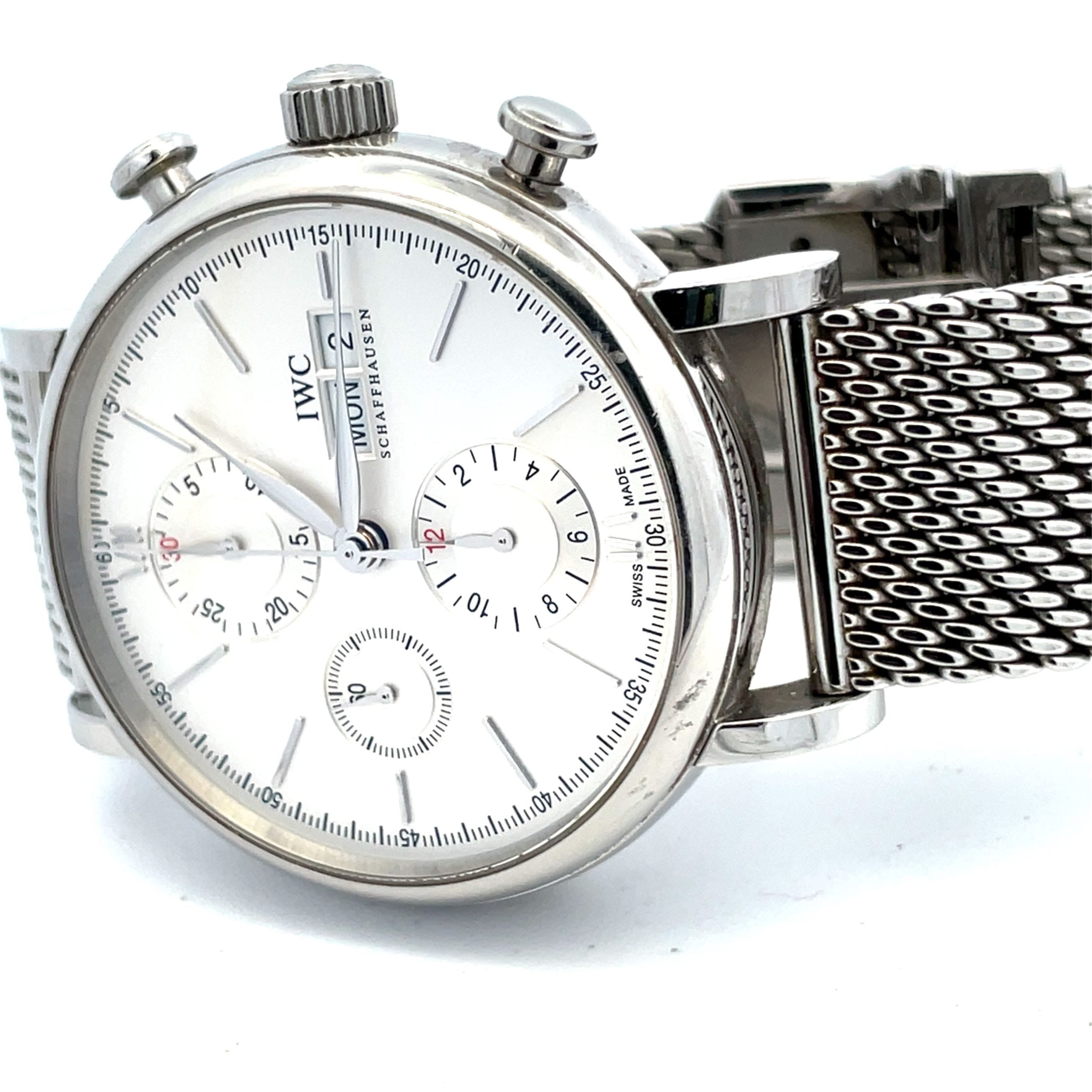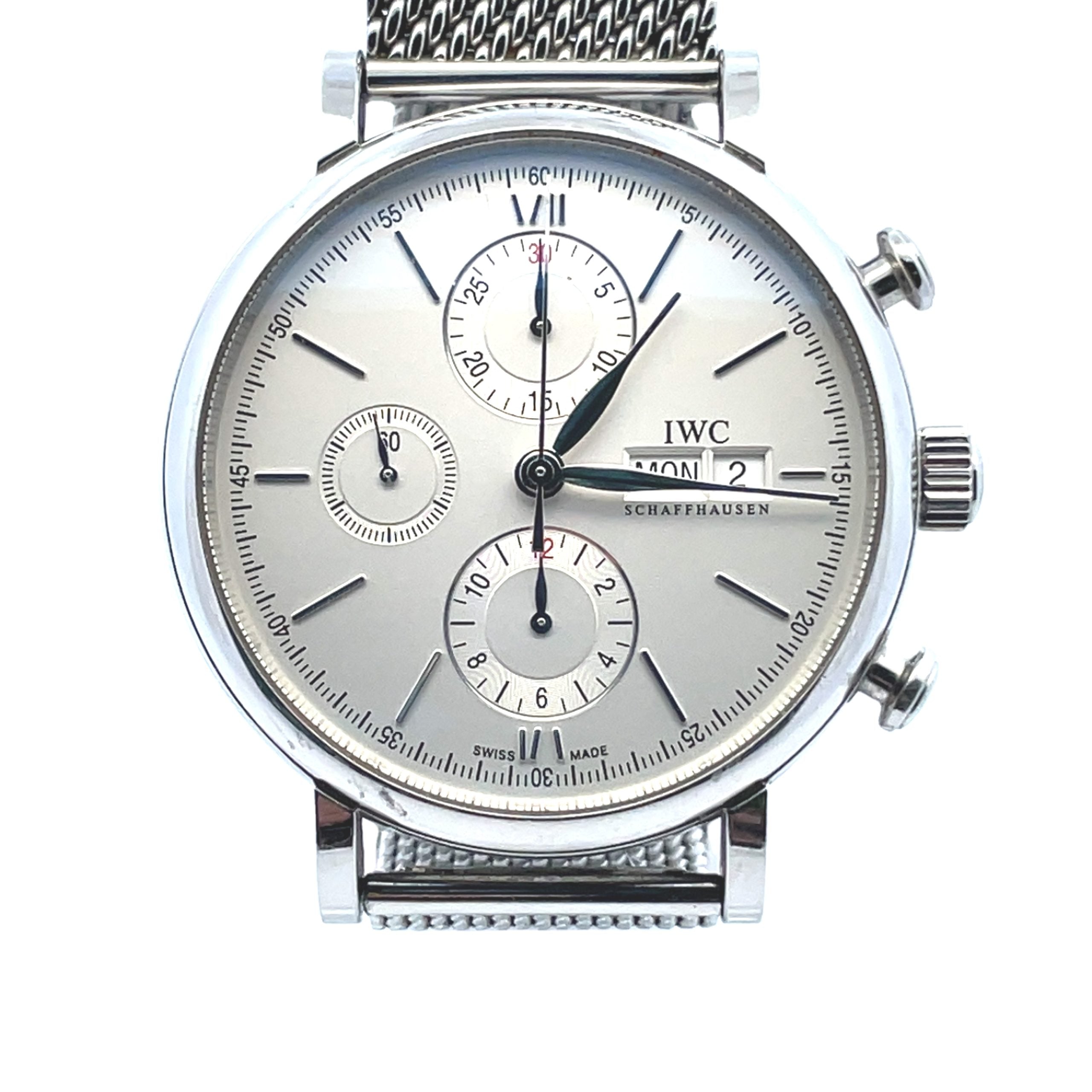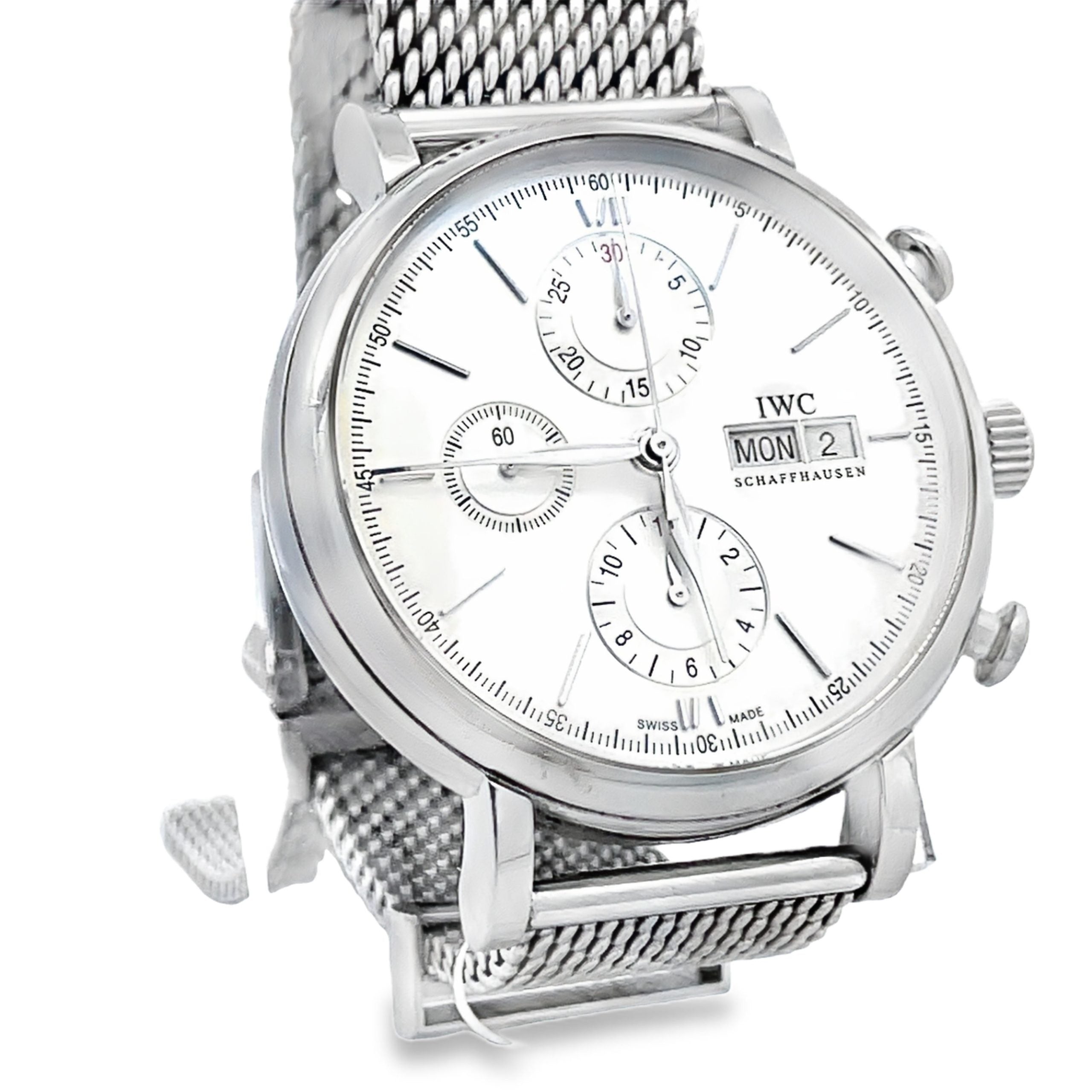 Stainless steel self-winding IWC Portofino chronograph, with day and date, circa 2012, measures 42mm in diameter with factory steel Milanaise mesh bracelet with deployant clasp. The silvered dial features applied steel baton hour markers, smaller constant seconds register at 9, 30 minutes and 12 hour registers, steel dagger hands, day and date at 3, all in excellent condition. The automatic 25 jewel calibre 75320 movement is warrantied by Aaron Faber for 1 year. Accompanied by box and booklet, good value!