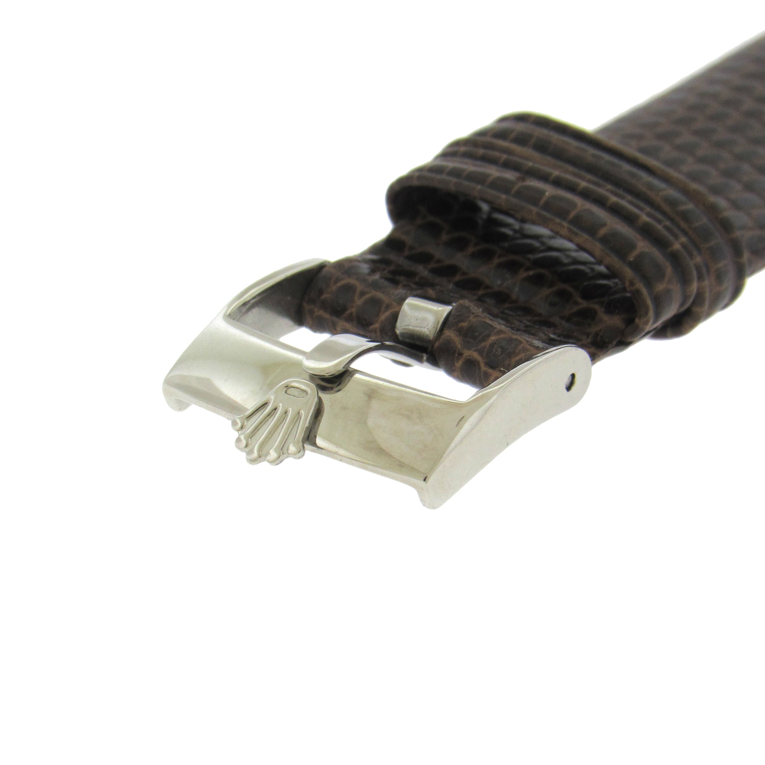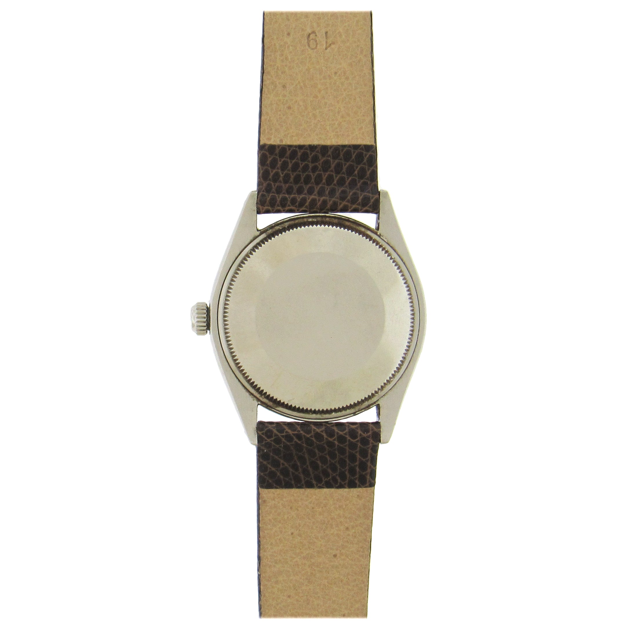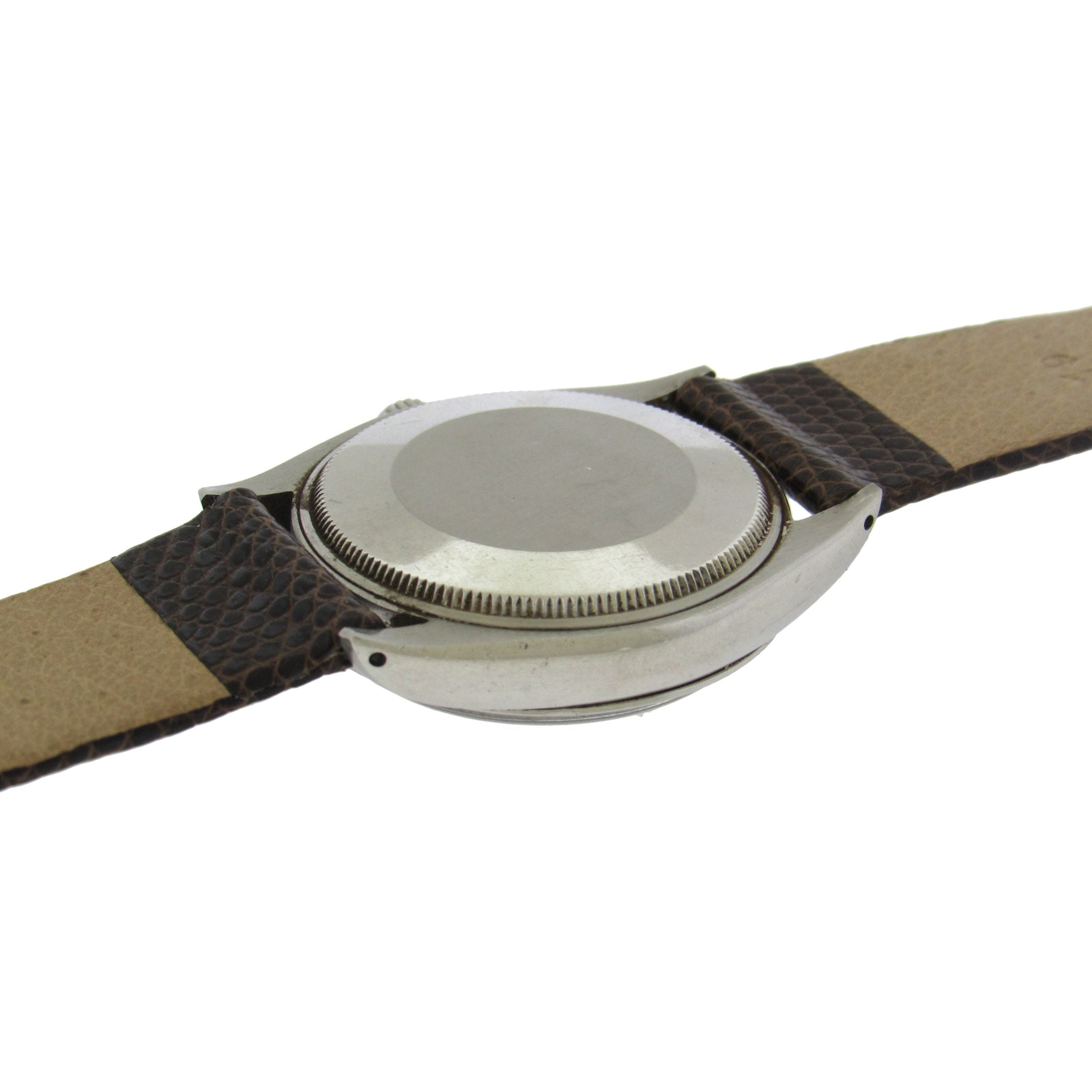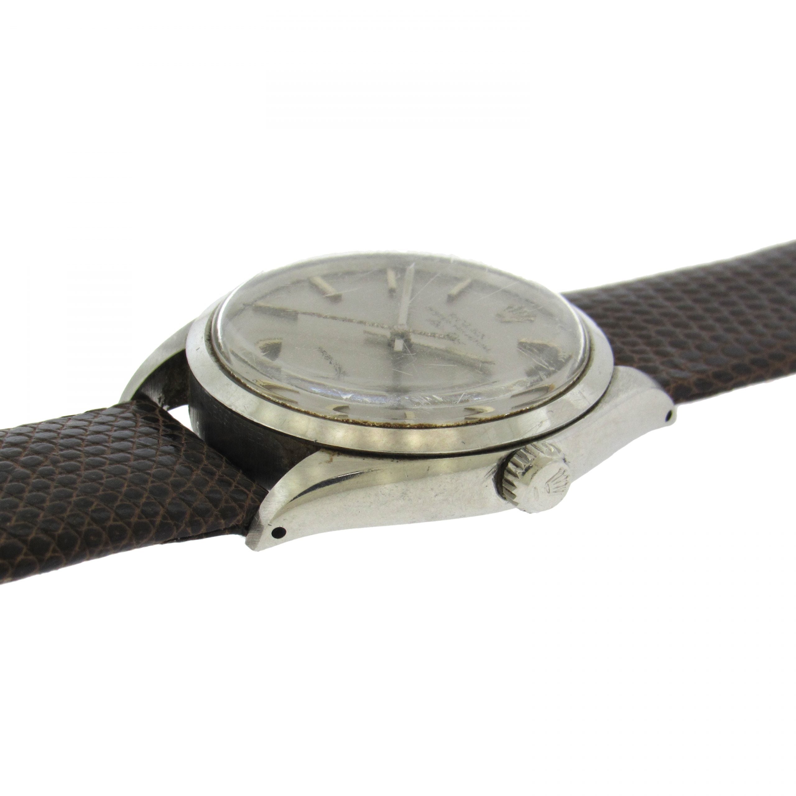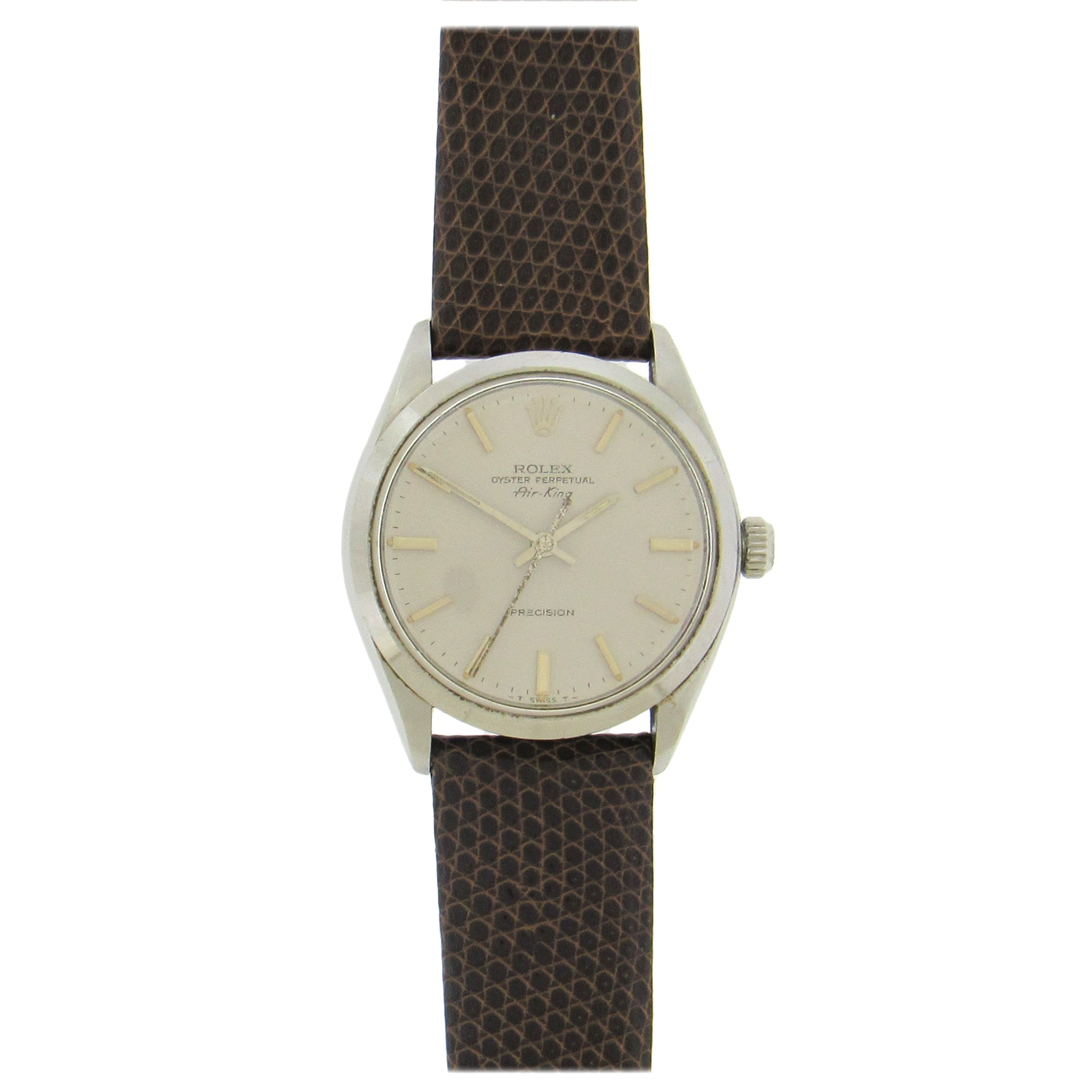 Stainless steel Rolex Ref. 5500 Air-King, circa 1957, is a center seconds, self-winding, water-resistant, stainless steel wristwatch with leather strap, Rolex buckle. The 34mm case has an inclined bezel, screwed-down case back and crown. The silver satiné dial features applied steel faceted baton indexes and luminous dots, outer minute/seconds track, and luminous steel baton hands. The movement is calibre 1520, 26 jewels, warrantied by Aaron Faber for 12 months.