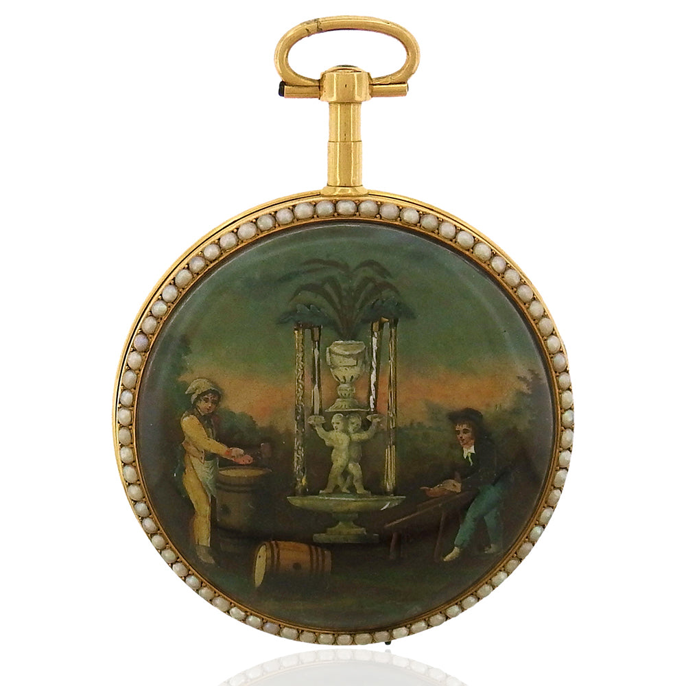 Rare eighteenth century Swiss enamel automaton open face pocketwatch is a high achievement of the arts of horology and engineering in 1700's Switzerland. The three-dimensional enamel pictures two young, woodworkers, one barrelmaker and the other planing wood, as the fountain at center splashes with water. The 55mm case has a seed pearl bezel surrounding the enamel side, reversing to a porcelain dial with painted black Arabic hours, and apertures to key wind the movement and set the time.