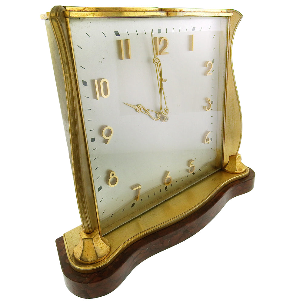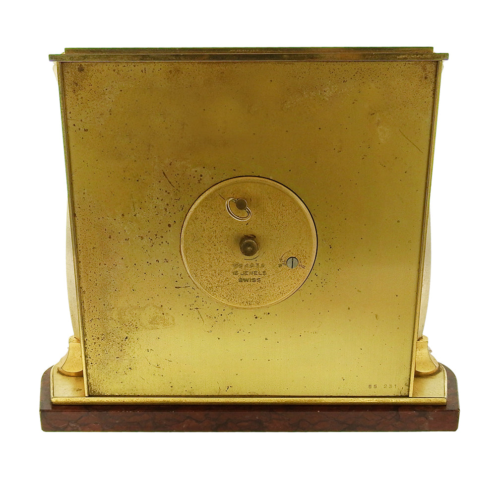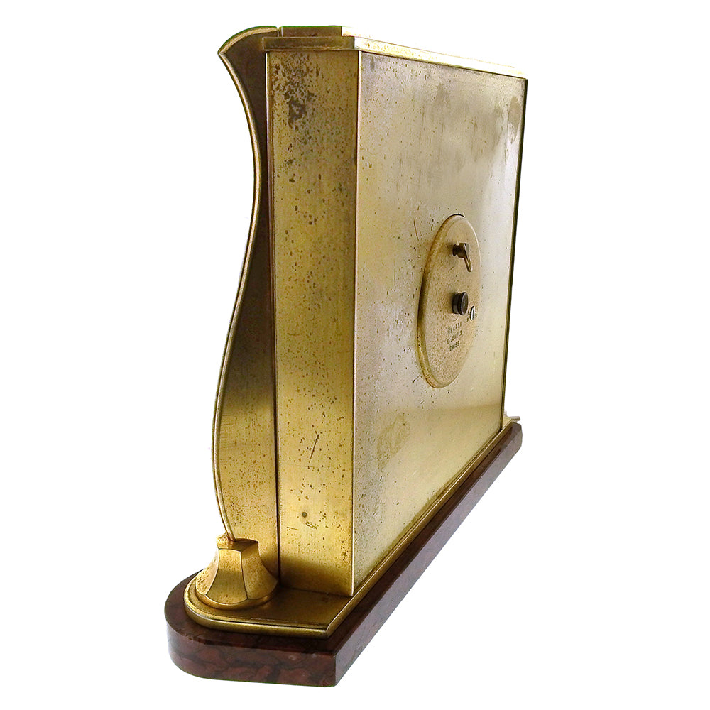 Vintage Art Deco brass mantel/desk clock, circa 1930's, features scrolled sides, scalloped base on red jasper base. The clock measures 8-1/2" x 6-3/4" x 2-1/2" deep. The silvered dial features applied Arabic numerals, curvlinear pierced hour and minute hands, outer minute chapter. The Swiss 15J mechanical wind movement is warrantied by Aaron Faber for 1 year.