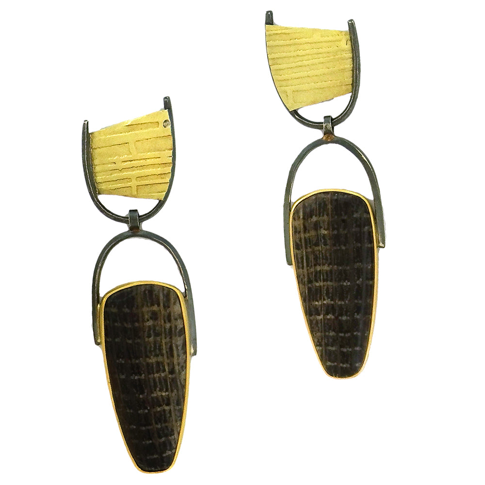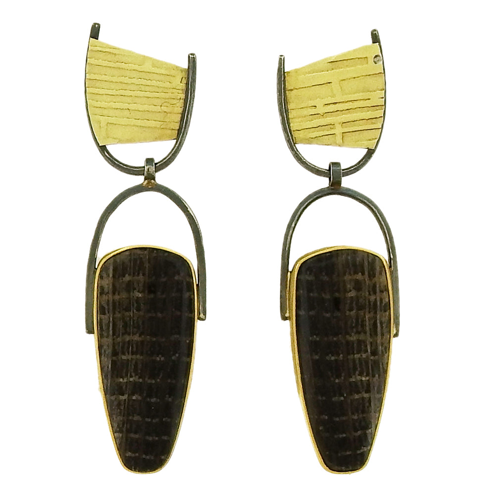 Nature is Sydney Lynch's inspiration and nothing could be more natural than these softly striped fossilized sequoia tree cabochons, set in oxidized sterling, 22K and 18K gold. Earrings measure 1/2" x 2" long, sterling posts.