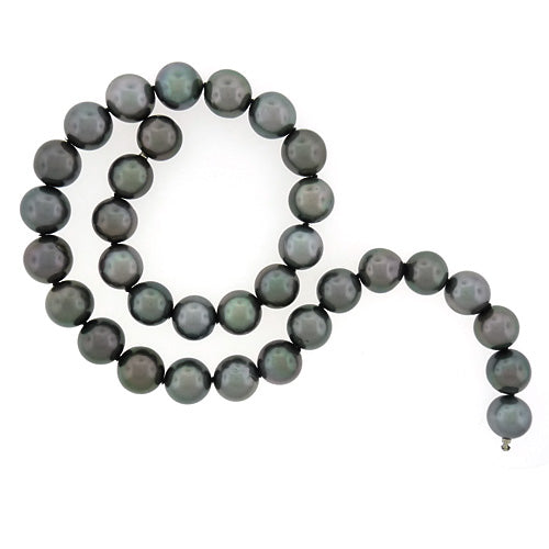 Richly dark Tahitian grey pearl necklace,16.75",combines 12mm-13mm large natural color gray and peacock --gray with green iridescence -- Tahitian pearls,with an invisible pearl clasp. You can wear the strand alone -- the hidden clasp is one of the pearls -- or with optional clasps from designer Michael Zobel,sold separately.