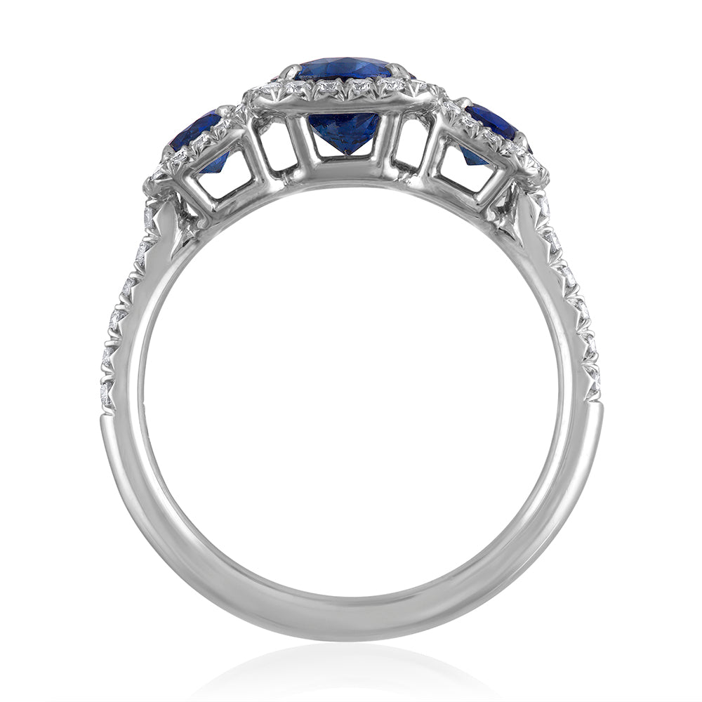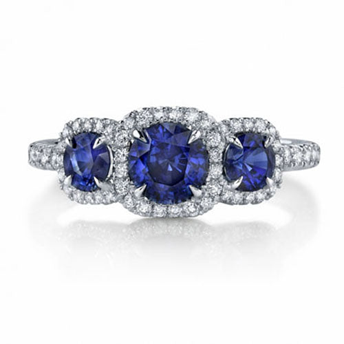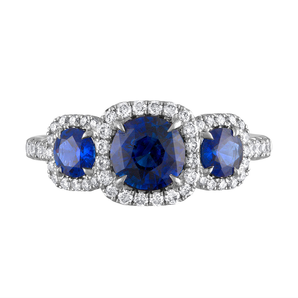 Sapphire three-stone ring from Omi Prive sets a round 1.14 carat center sapphire,flanked by two 0.30 ct sapphires,in a cushion-form diamond pave setting,0.40 cts tw. The ring measures 3/4" x 1/4".