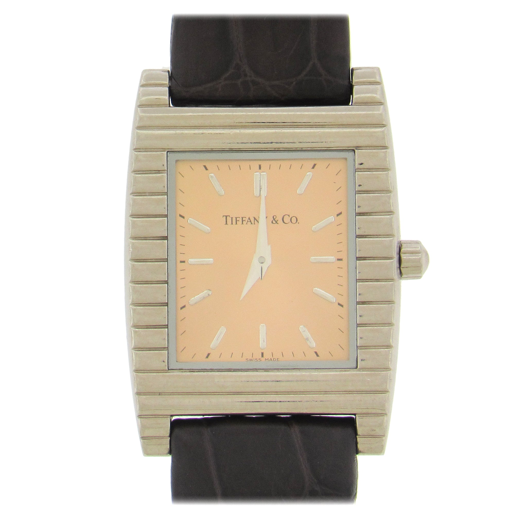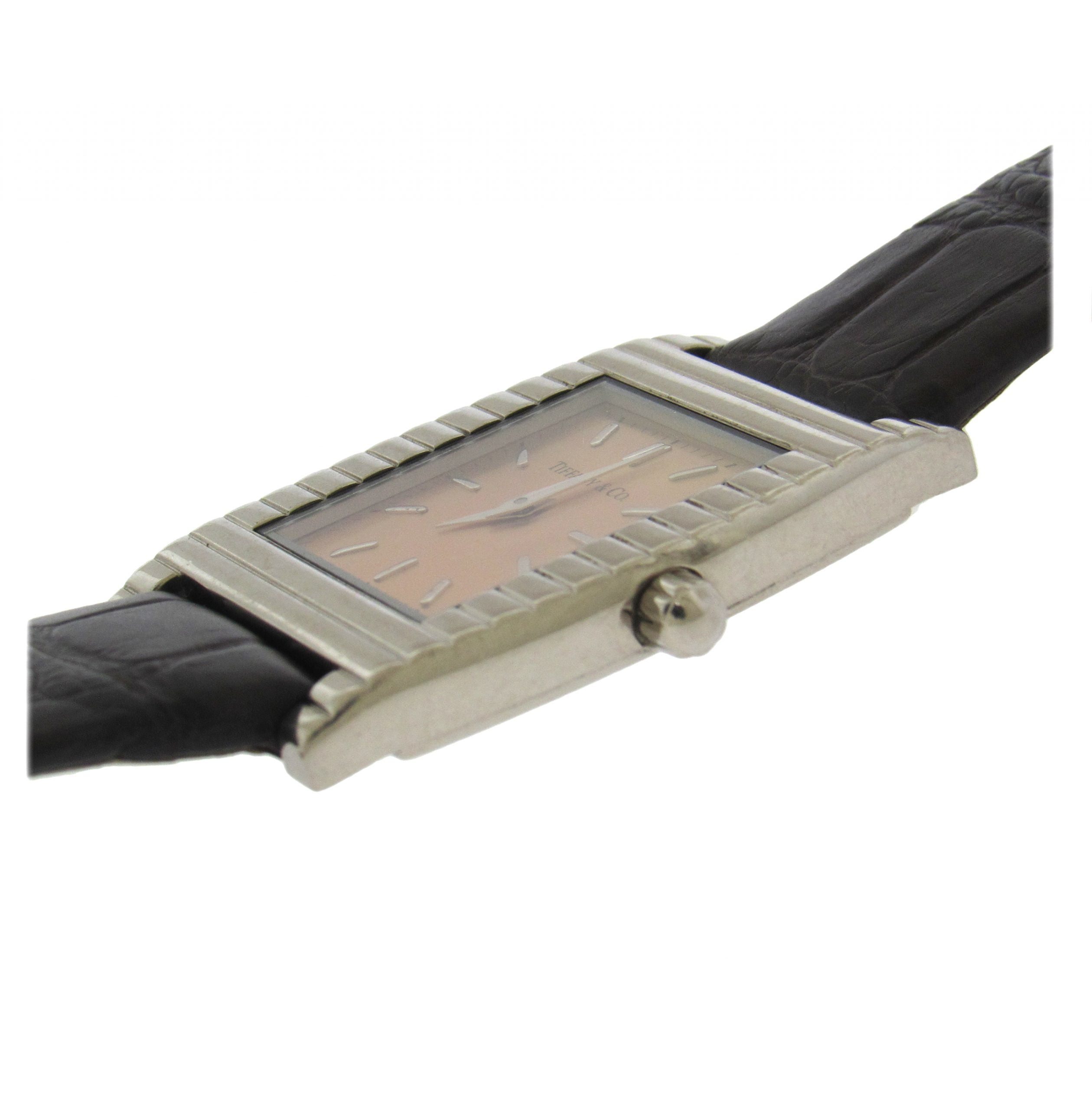 Elegant 18K white gold Tiffany quartz wristwatch, circa 2000, has a 28mm x 39mm case with snapback, stylized corrugated bezel, with matching Tiffany 18K buckle, salmon dial with applied white gold hour markers and dauphine hands. The quartz movement is warrantied by Aaron Faber for 1 year.