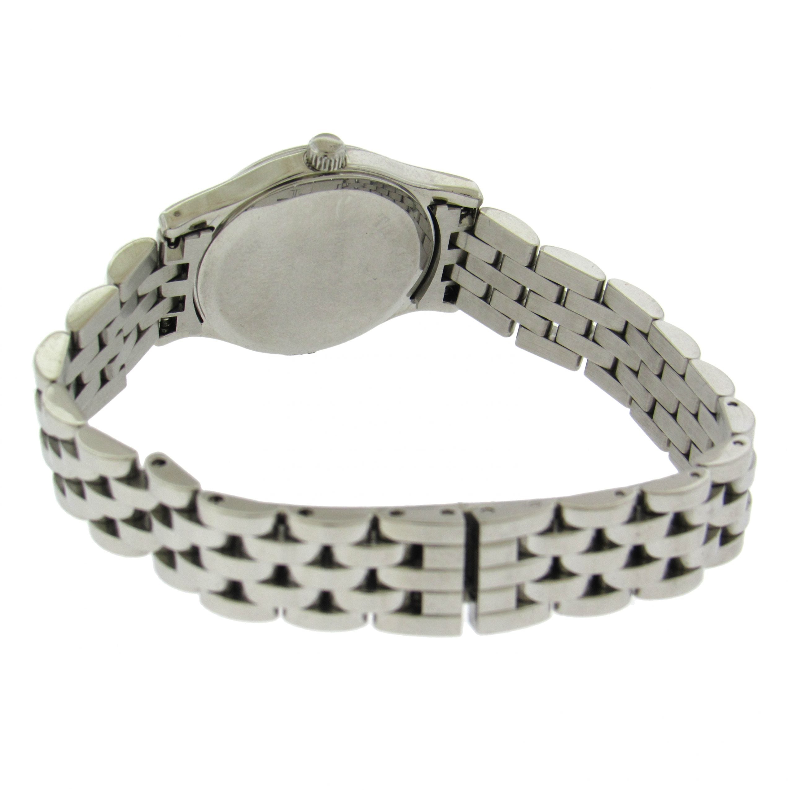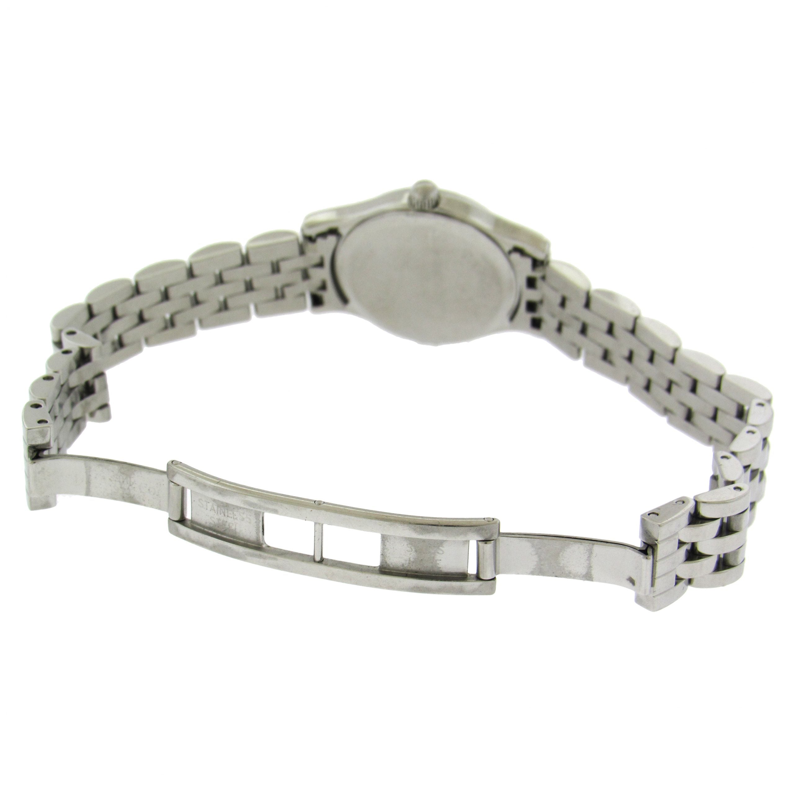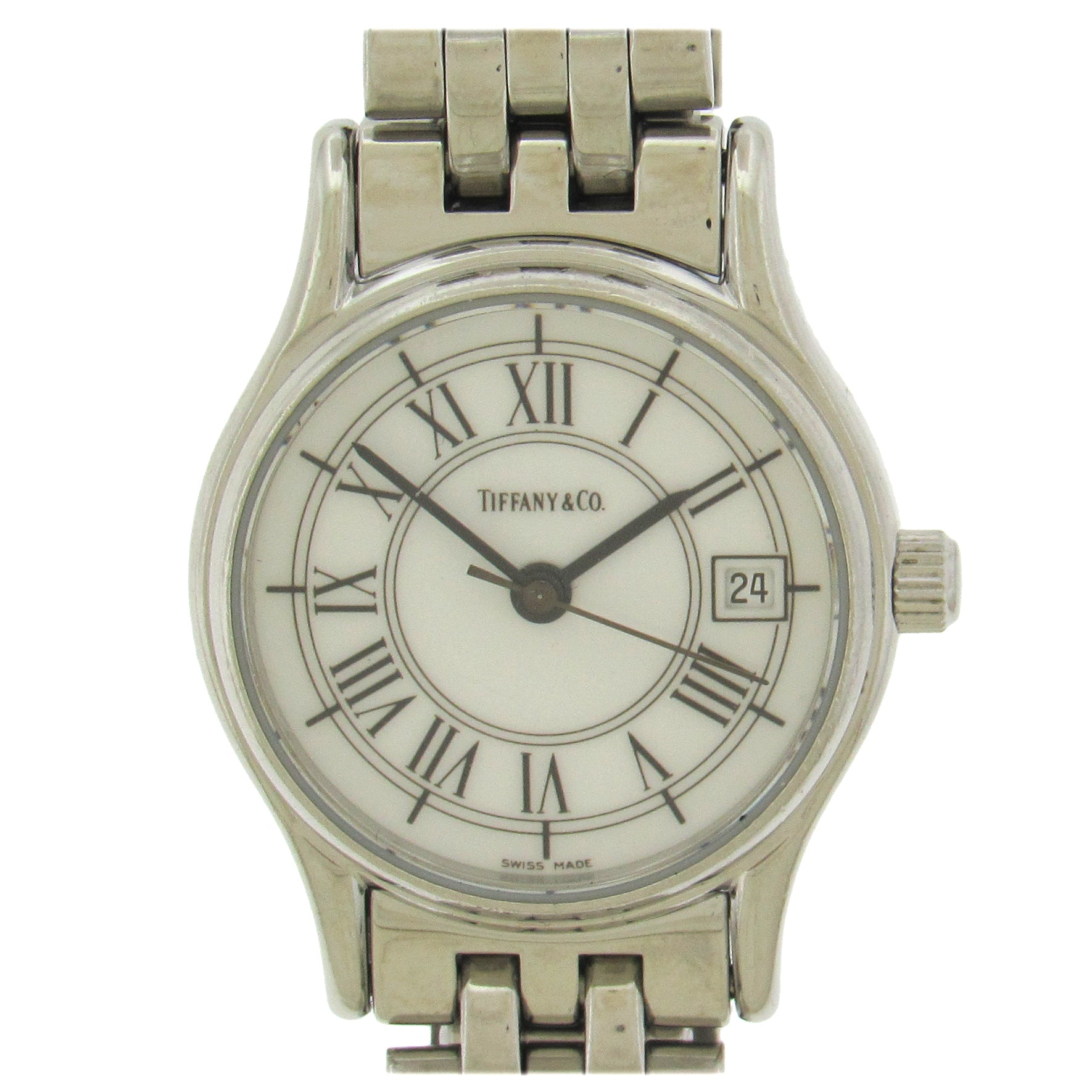 Stainless steel Tiffany & Co women's classic date wristwatch has a 23mm case, white porcelain dial with black center seconds hand, black baton hands, black Roman numeral painted hours, date window at 3, and Tiffany link double deployant bracelet, fits 6-1/2". The quartz movement is warrantied by Aaron Faber for 1 year.