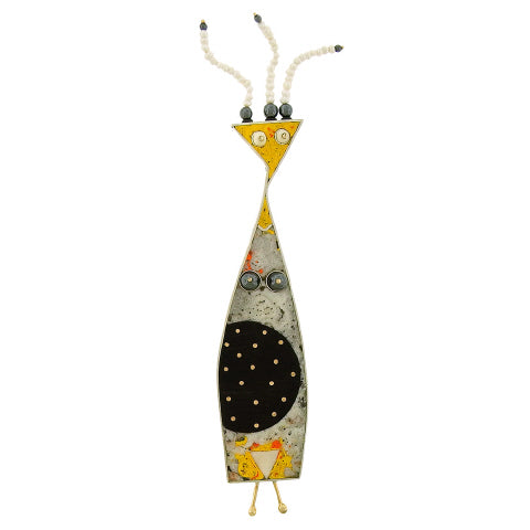 Tod Pardon's sculpture and brooch, titled 'Fondip', is a mixed media brooch, the sterling silver form inlaid with colors, rosewood, black pearls and seed pearls, with 14K details. 'Fondip' measures 1-1/4" x 6-3/8".