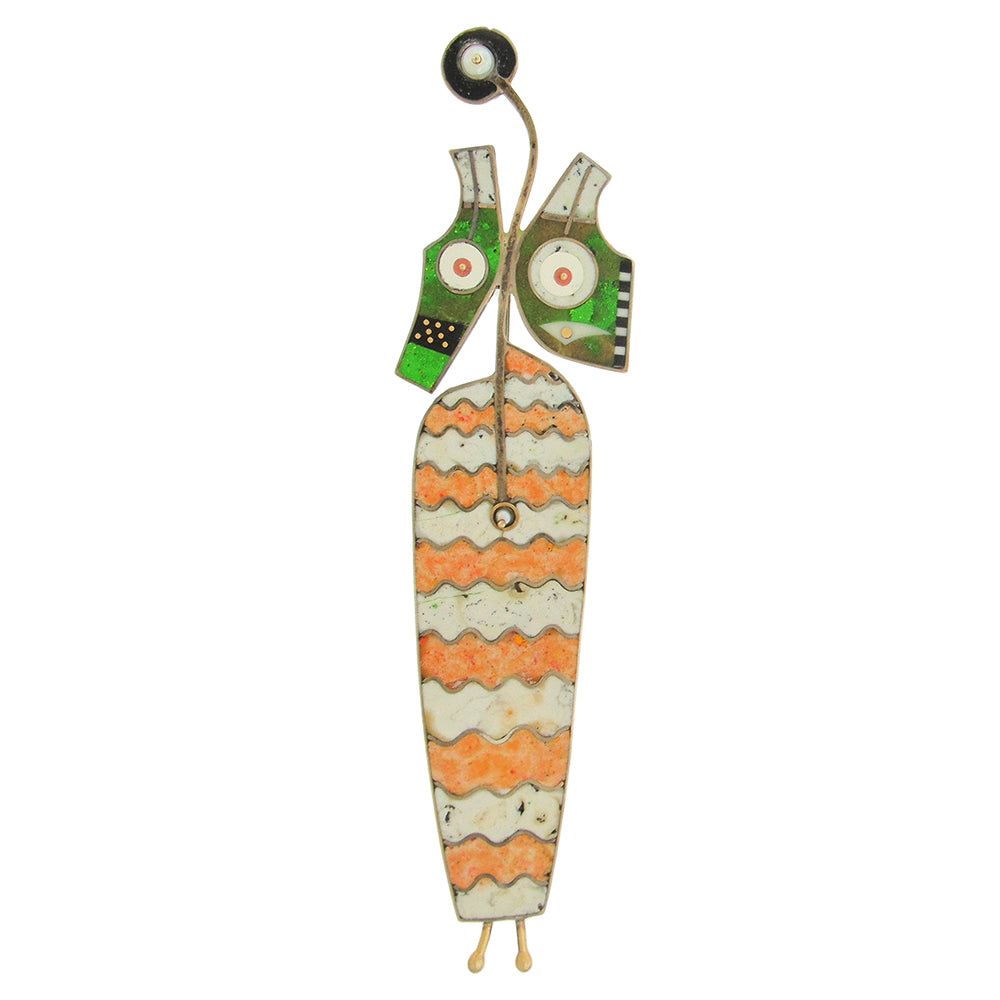 One of Tod Pardon's most delightful sculpture/brooches, 'Miladie' dates from 2000 and is beautifully crafted in resin, bone, sterling silver, wood, 14K gold and pearl. The brooch, from a private owner, measures 1-1/2" x 6-1/2". Accompanied by original stand, 2-1/4" x 2-1/4" x 1-1/2" high