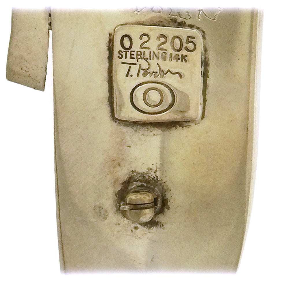 Tod Pardon's 2005 'Unatopa', a brooch and sculpture brooch in sterling silver in Tod’s classic technique of pigmented inlay, the complex patterning set also with wood, turquoise and pearls.The pin measures 1-3/8" at the widest by 5-1/2" high. Accompanied by wooden stand, 2-1/2" x 2-1/2" x 4", to display when not being worn.