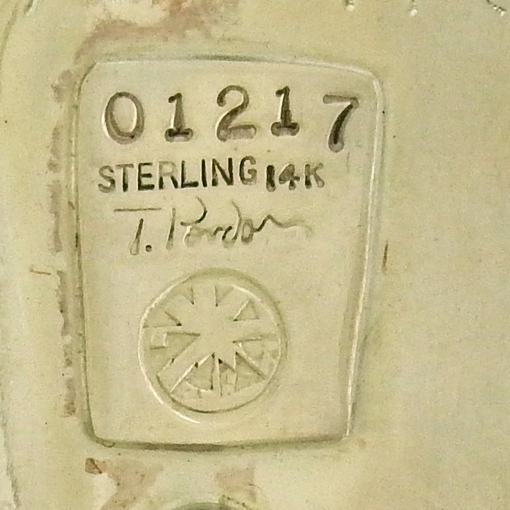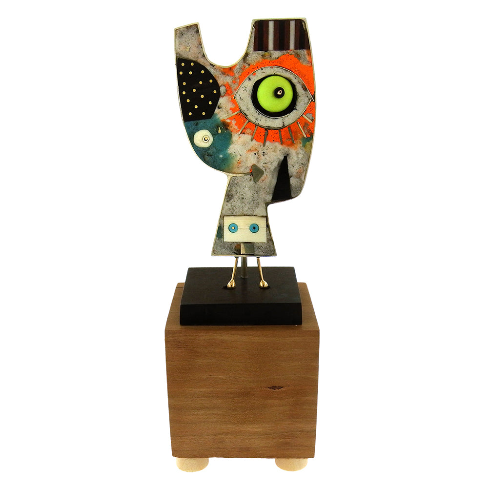Tod Pardon's one-of-a-kind sculptures that can also be worn as brooches are collected widely, but each one is unique, made by the artist in his studio, numbered and titled. Here, 'Yontal', mixed media with wood and turquoise, bone and glass, in sterling silver and 14K gold with a stand to enjoy when not wearing. The brooch measures 1-7/8" x 3-3/4". The stand measures 2" x 2-1/2" x 2" deep.