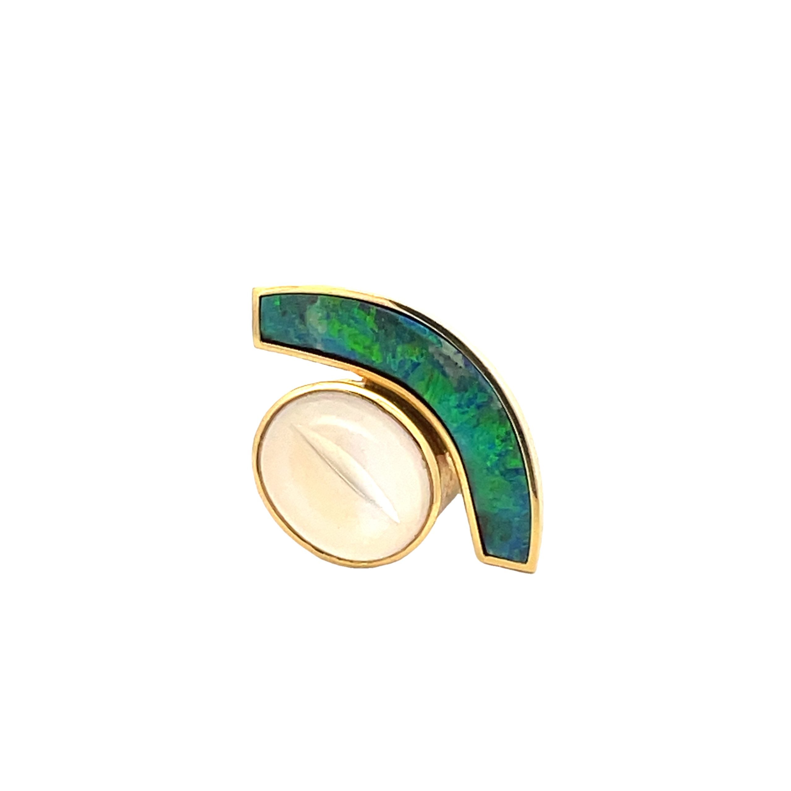 Magnificent boulder opal, 4.68 carats, is cut in a crescent that wraps around a luminous 7.05 carat moonstone with a cat's eye facet by Tom Munsteiner. The ring measures 1" x 7/8" and is size 7.