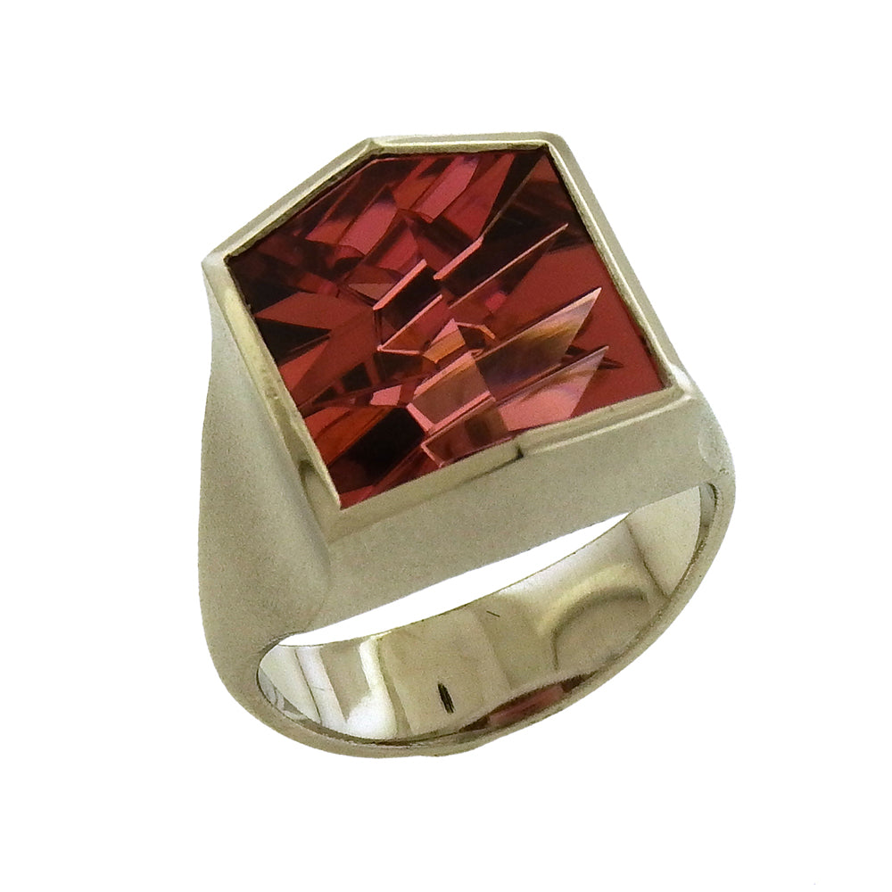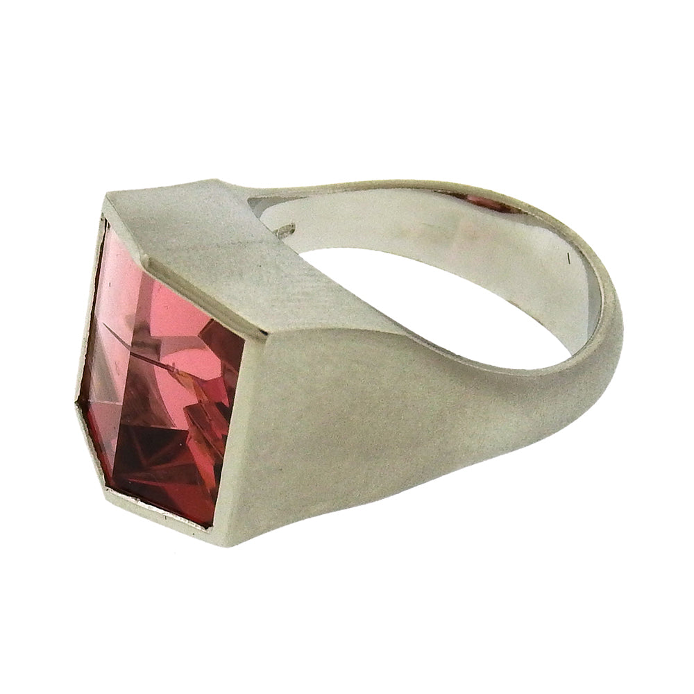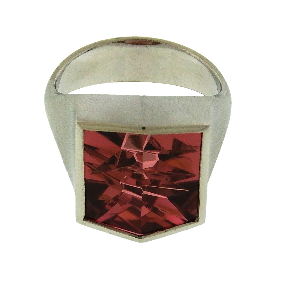 Tom Munsteiner's deep pink square gem tourmaline, 7.32 carats, is incised below and beveled in two facets on top, set in platinum. The ring measures 1/2" square x 3/8" above the hand and is size 6.5.