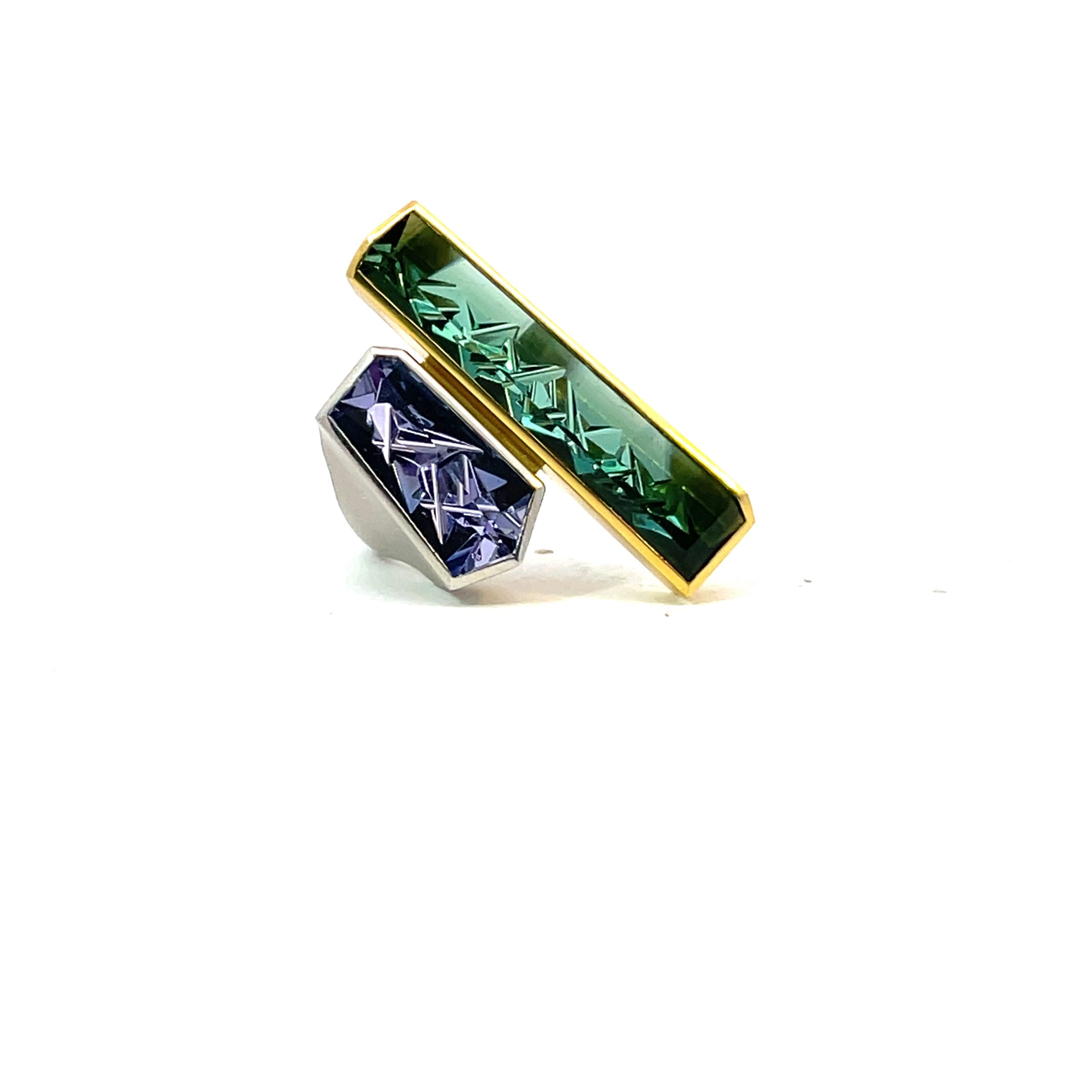 Green tourmaline and blue tanzanite in a sumptuous ring cut by the late Tom Munsteiner, the 7.01 rectangular tourmaline set in 18K yellow gold, alongside a 4.79 carats pentagonal tanzanite set in platinum, both with Tom's signature undercutting. The ring measures 5/8" x 1-7/8" and is a sizeable size 7.25.