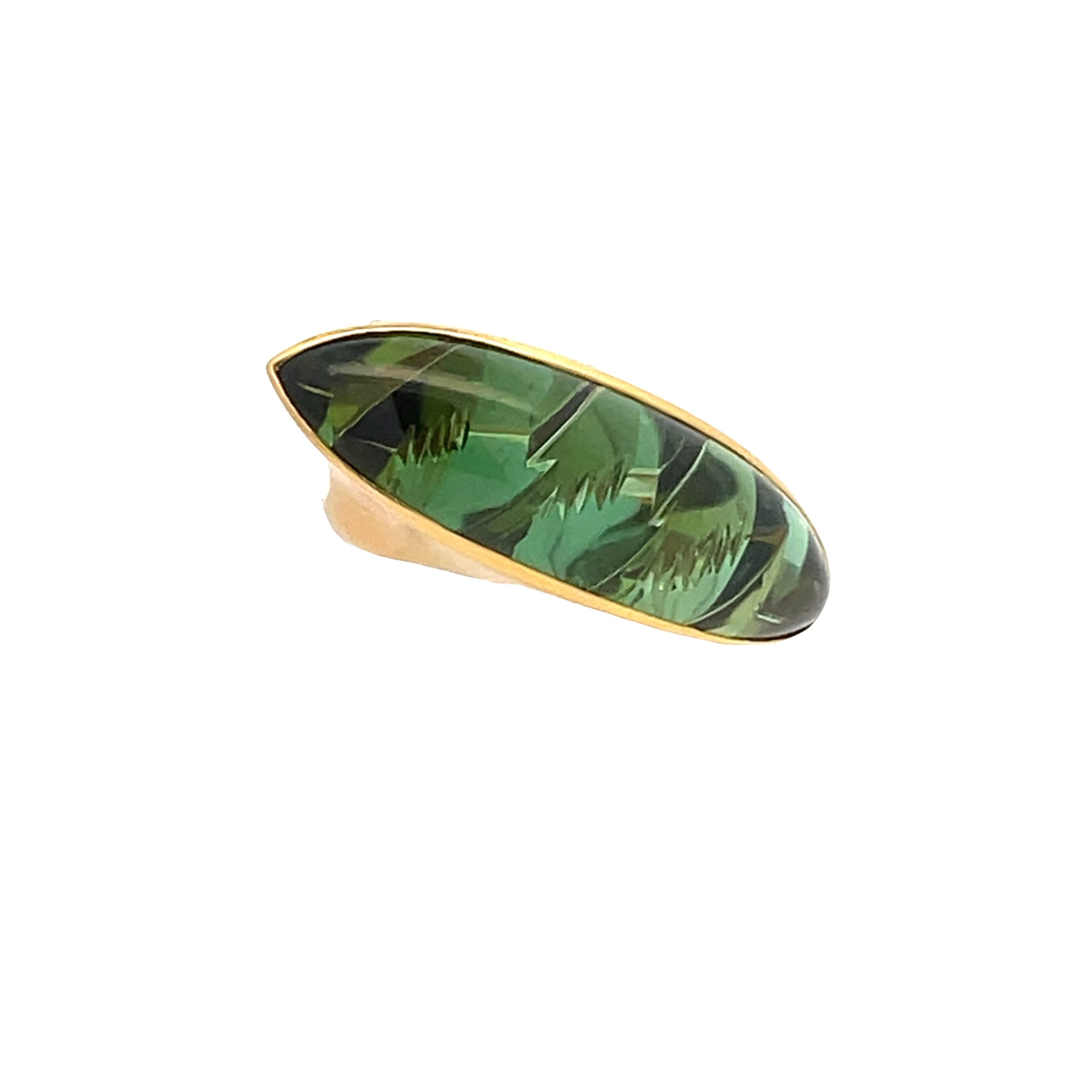 Magnificent large green tourmaline ring, 28.85 carats, cut by Tom Munsteiner in a marquise-shape curved cabochon, then back-cut in a ziggurat pattern, set on the diagonal in an 18K yellow gold matte mounting. The ring measures 1/2" x 1-1/2" and curves comfortably on the hand, size 7.