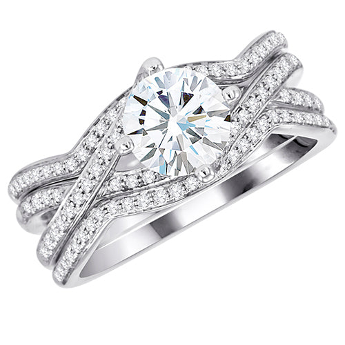 Simon G's interwoven diamond engagement rings and wedding bands are airy and comfortable, and can be worn with one or two bands. As shown first image, the lacy twined engagement ring mounting, micropavé-set with 0.29 cts ,with one band, and as sold here, with one on each side. Solitaire semi-mounting for your or our diamond.
