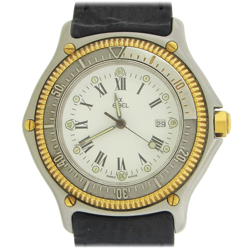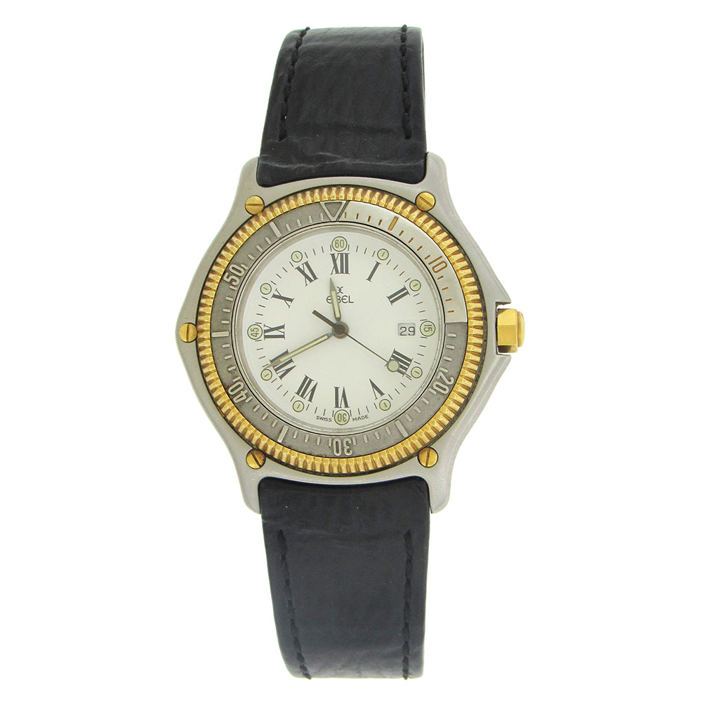 Stainless steel and 18K gold Ebel Discovery diver's watch, circa 2000, is a 38mm steel water resistant watch with screwed-down steel back, leather band with steel deployant, 18K gold crown and coin-edge bezel, porcelain white dial with date window at 3, center second sweep hand and outer luminous 13 second markers. The quartz movement is warrantied by Aaron Faber for 1 year.