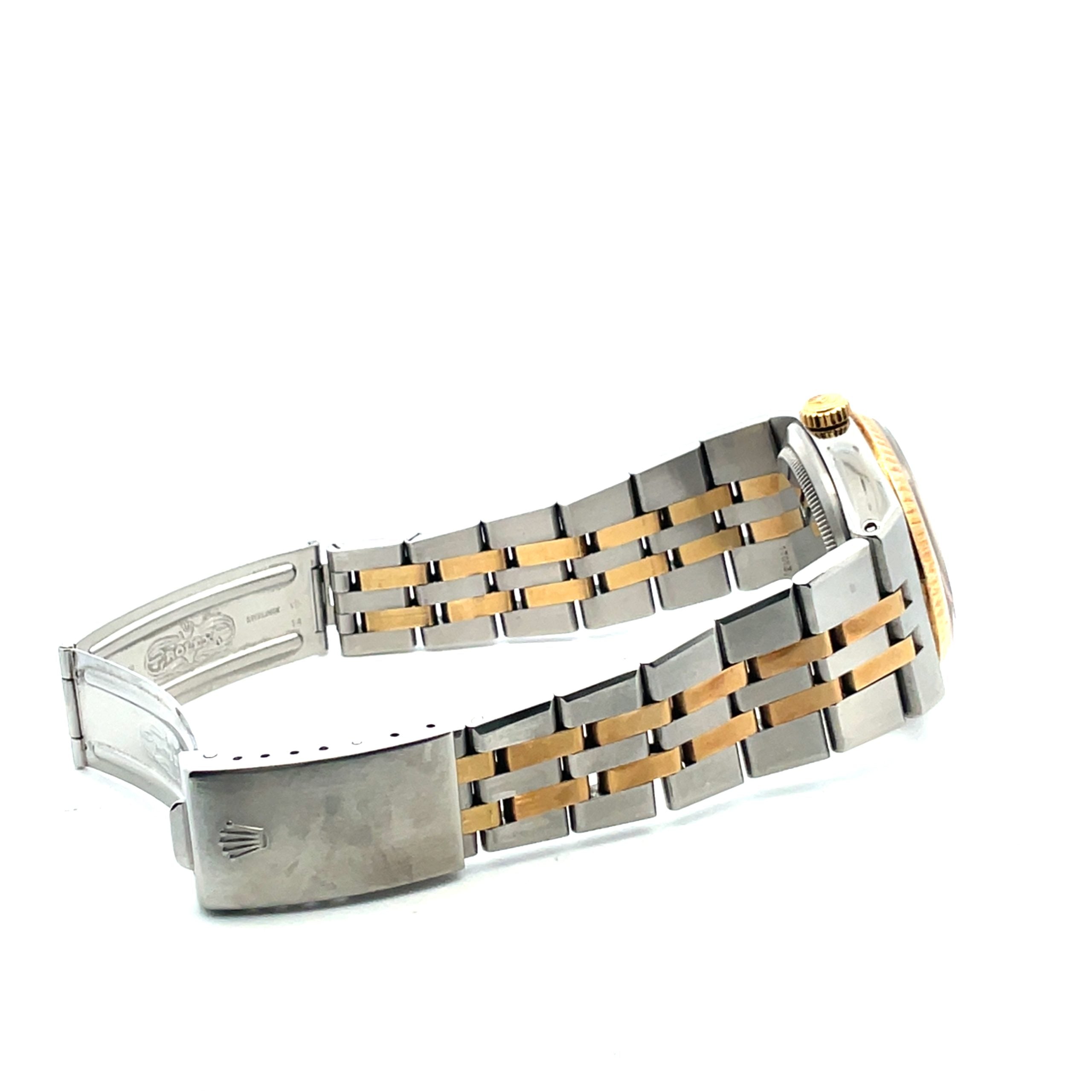 Two tone steel and 14K gold Rolex,Oysterquartz Datejust, Ref. 17013, made in 1979, is a tonneau-shaped, center seconds, water-resistant, stainless steel and 14K yellow gold quartz wristwatch with date and an integral stainless steel and 14K yellow gold Rolex link bracelet with deployant clasp. Accompanied by box, booklet and original certificate. The 36mm x 42mm tonneau case has a screwed-down case back and crown, yellow gold fluted bezel, and sapphire crystal with cyclops lens. The champagne dial features applied yellow gold baton indexes and luminous dots, outer minutes/seconds divisions, aperture for the date, and luminous yellow gold baton hands. The movement is caliber 5035, 11 jewels, hack mechanism, with quartz standardization, warrantied by Aaron Faber for 2 years.