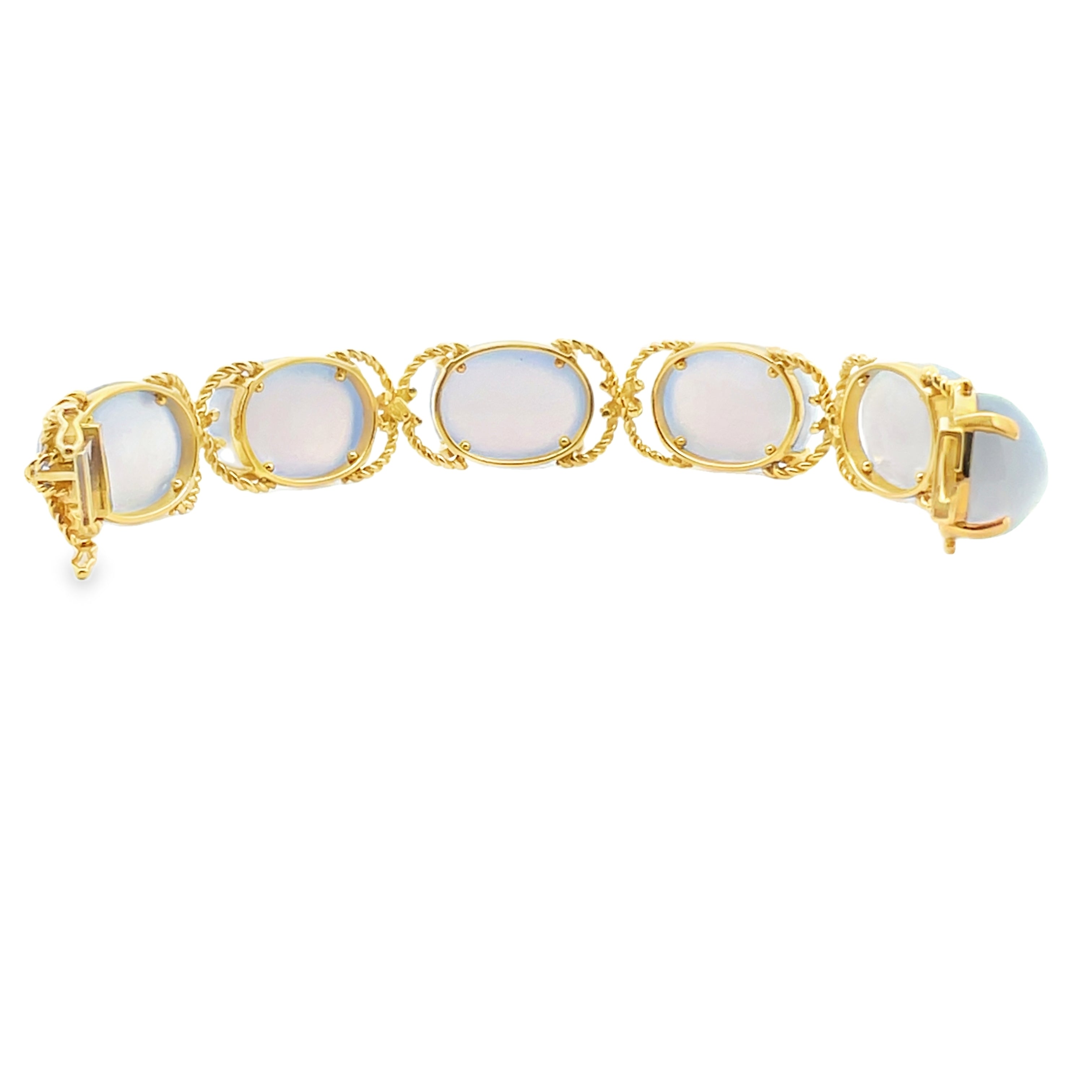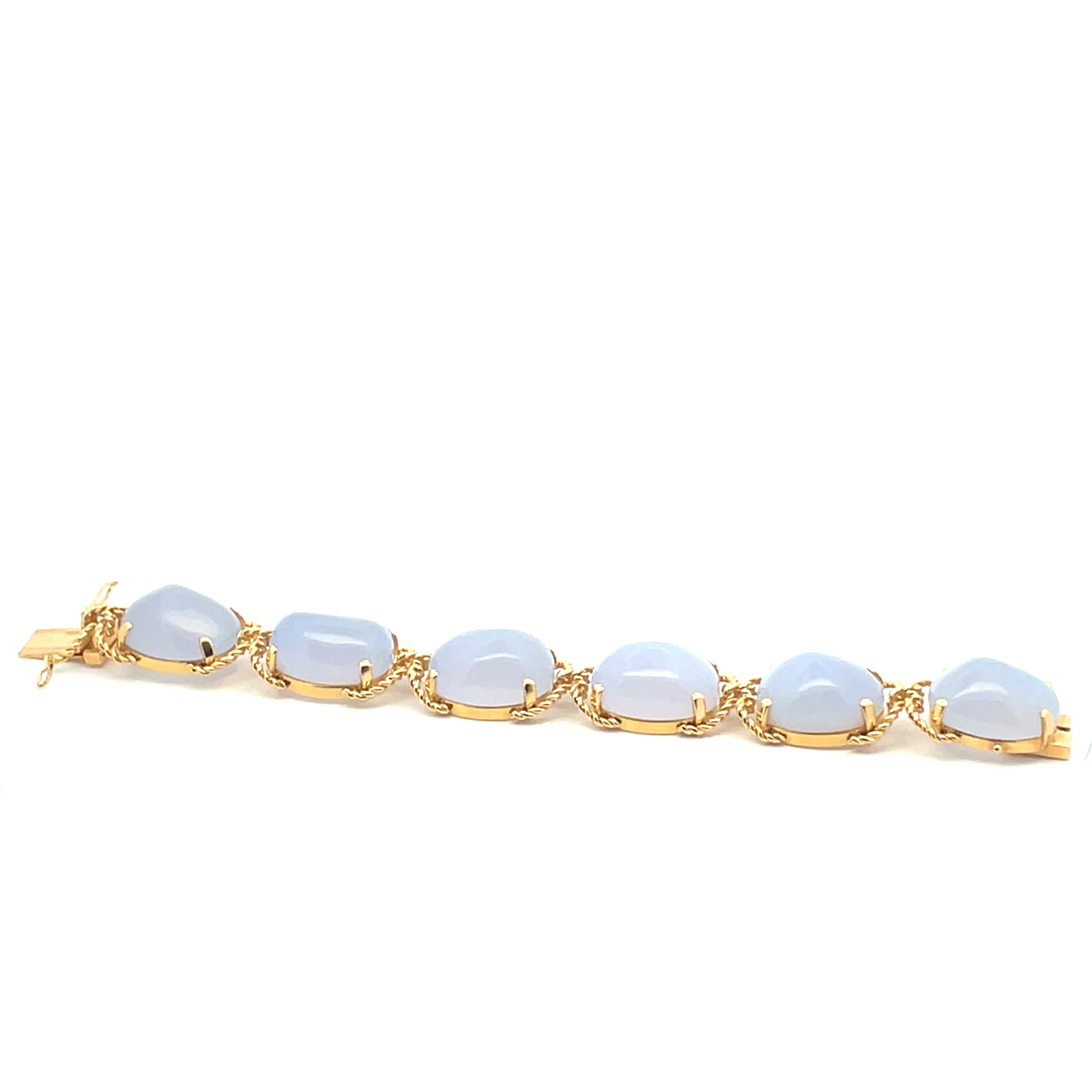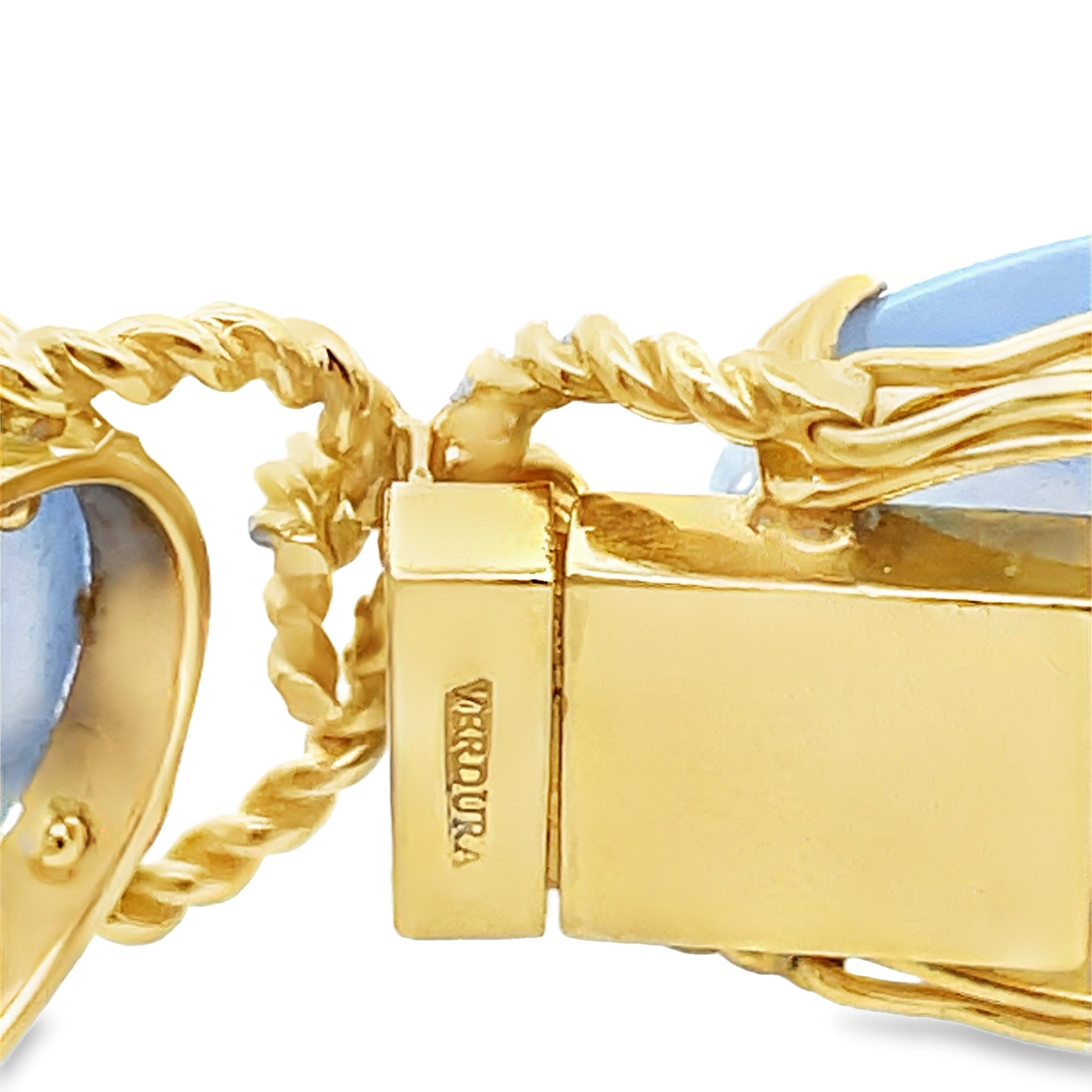 Oval blue chalcedony cabochon Pebble bracelet from Verdura, set in 18K yellow gold rope twist links, from a private estate. The Pebble bracelet collection traces its history to the 1940's, from founder and designer Fulco di Verdura. The bracelet measures 3/4" wide x 7" long.