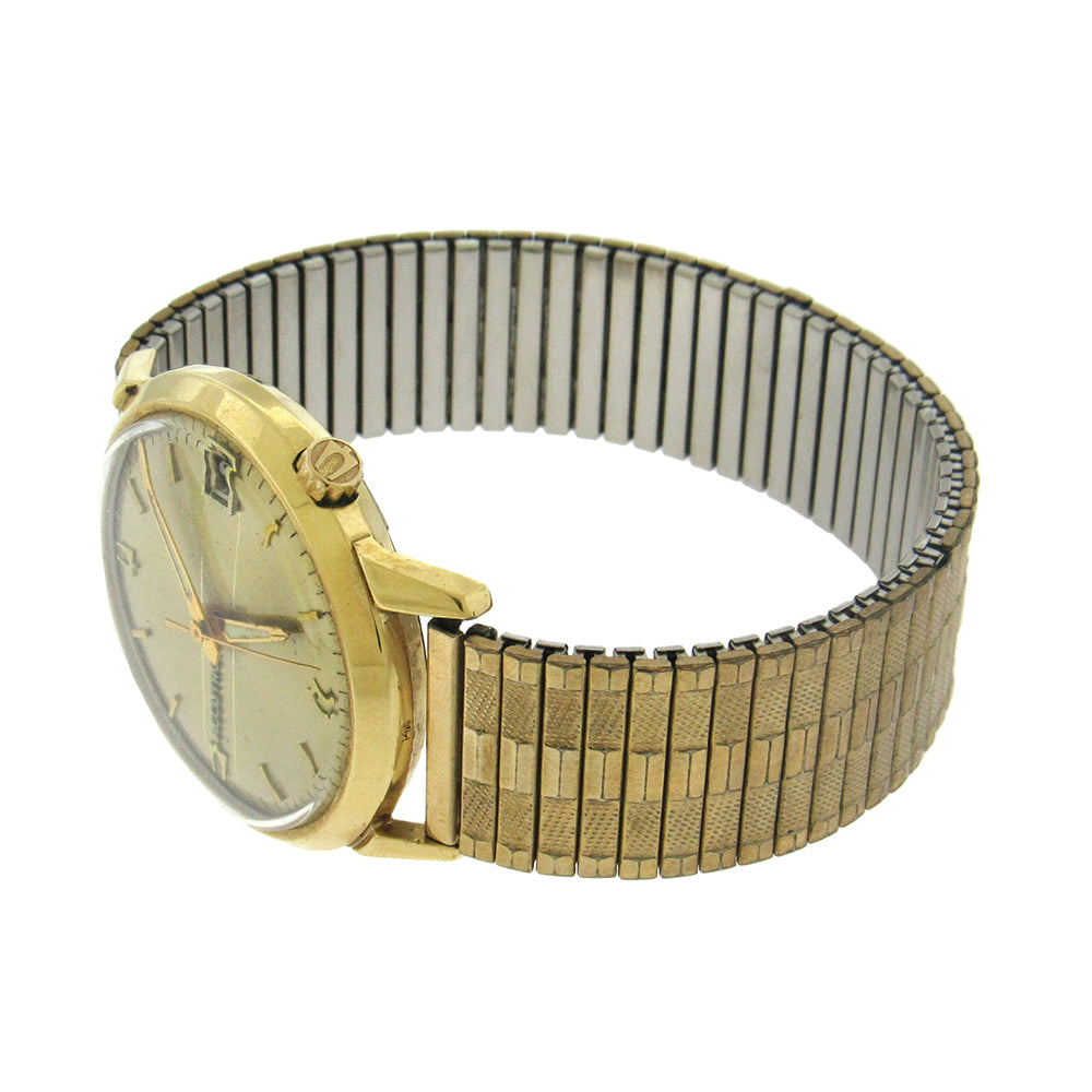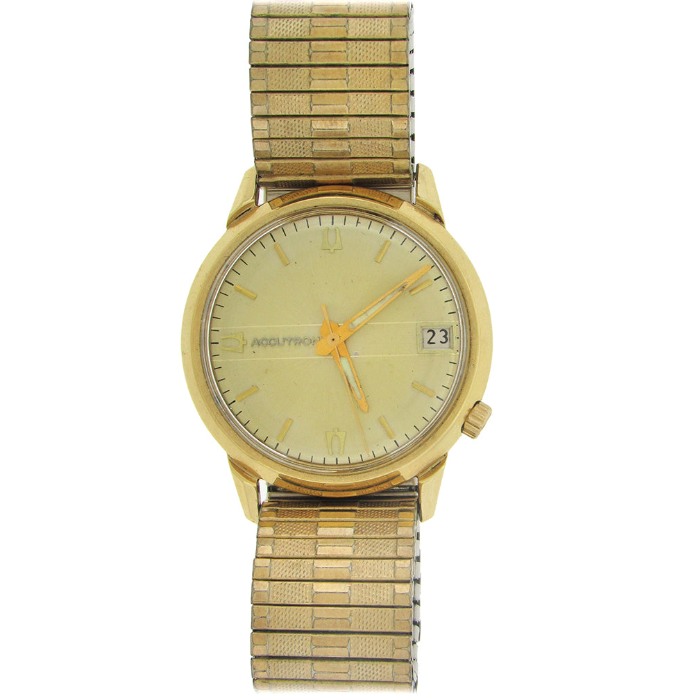 14K gold Bulova Accutron date, made in 1966, is a collectible vintage electro-mechanical wristwatch made famous by Bulova in the mid-20th Century. The 35mm case has a screw-down case, champagne dial with date at 3, Accutron tuning fork and dart applied gold hour markers, center second sweep hand. The movement is warrantied by Aaron Faber for 1 year. Period stretch steel and gold plate bracelet.