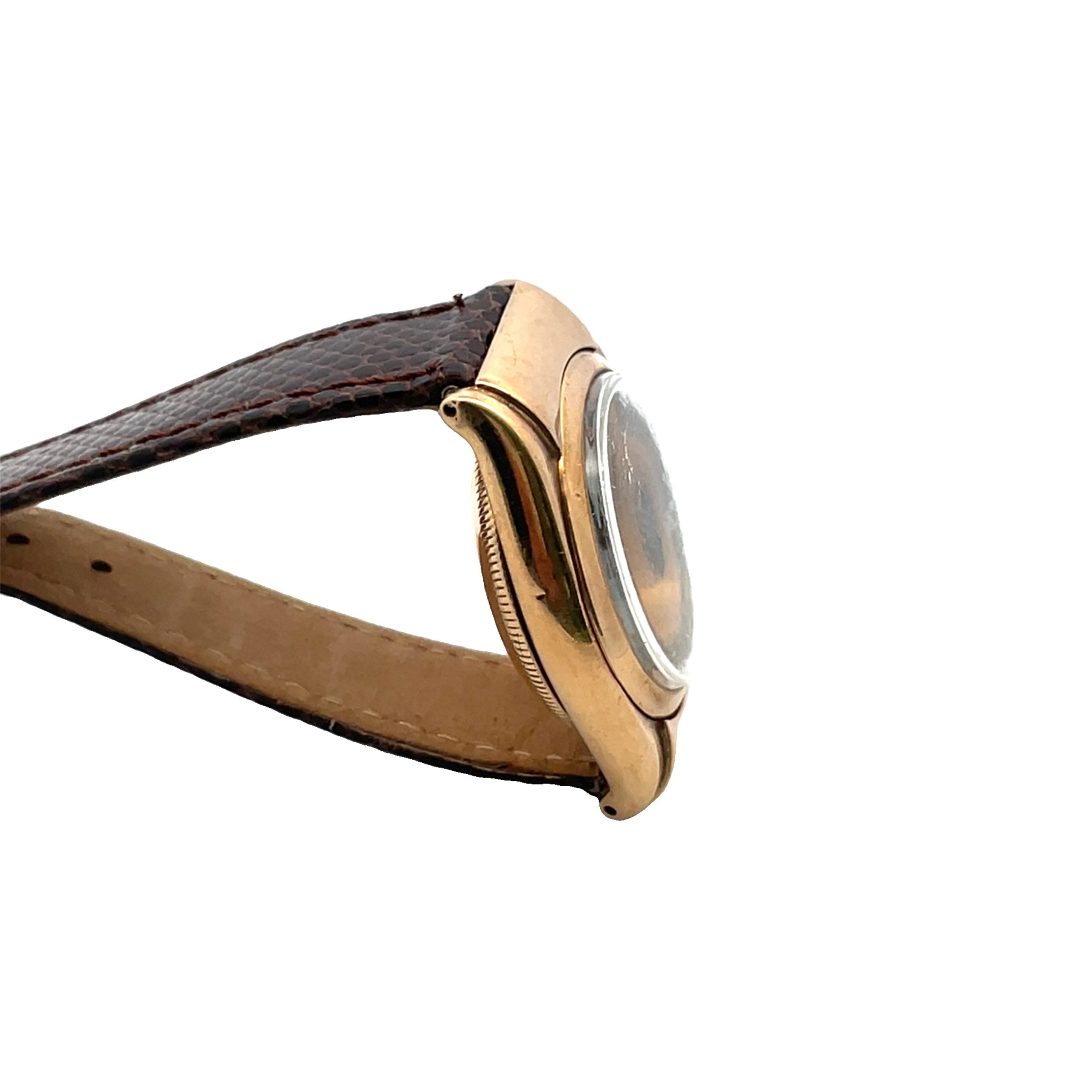 14K yellow gold Rolex Oyster Perpetual hooded bubbleback, Ref. 3065, produced in the late 1940's, is a rare center-seconds, self-winding, water-resistant, tonneau-shaped, 14K yellow gold wristwatch. The 32mm case has a screwed-down case back and crown, hooded lugs. The black dial features with applied gold dart indexes and alpha gold hands. The movement is warrantied by Aaron FAber for 18 months.